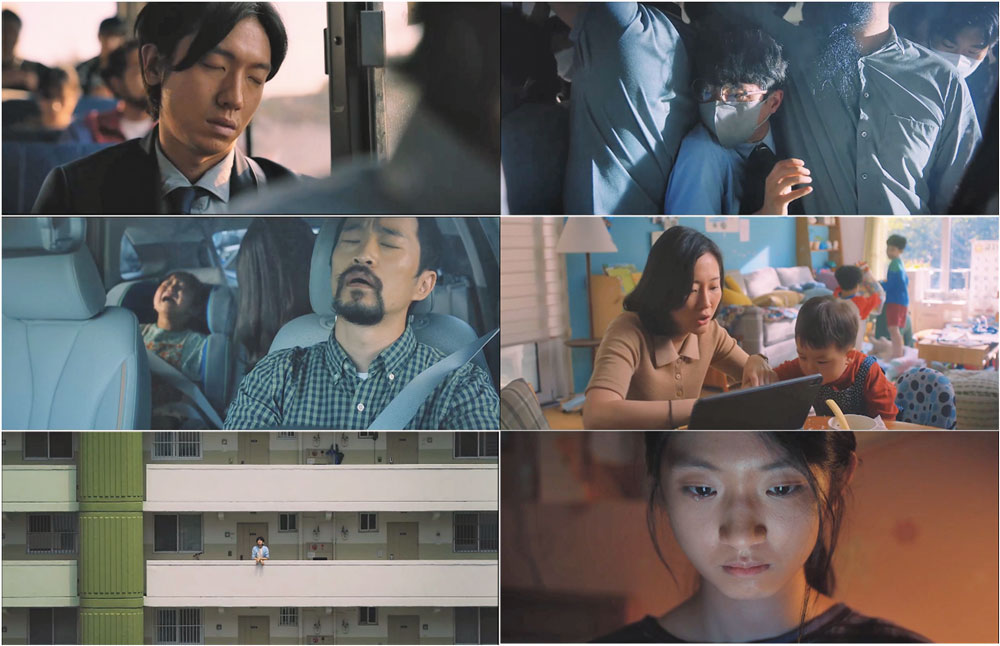 영상의 첫머리에는 힘든 일상을 살고 있는 사람들이 등장한다. 새벽 6시 알람에 이불을 뒤집어쓰는 여자, 만원 지하철 사람들 틈에 끼어 움직이지도 못하는 남자, 도로는 꽉 막혀 있는데 뒤에 태운 아이는 울고 있는 난처한 아빠, 아이의 방해에 안절부절하는 재택근무 엄마….