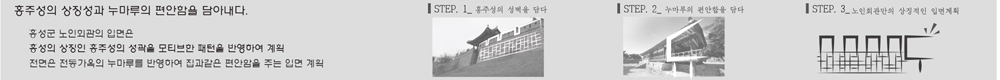 홍성군 내 노인들을 위한 복지시설 계획안으로 홍성의 역사, 대청마루의 편안함, 마당과 중정의 계획을 통해 휴게 및 복지 공간을 제공하고자 했다.