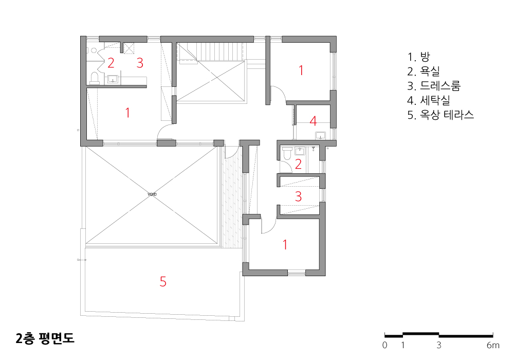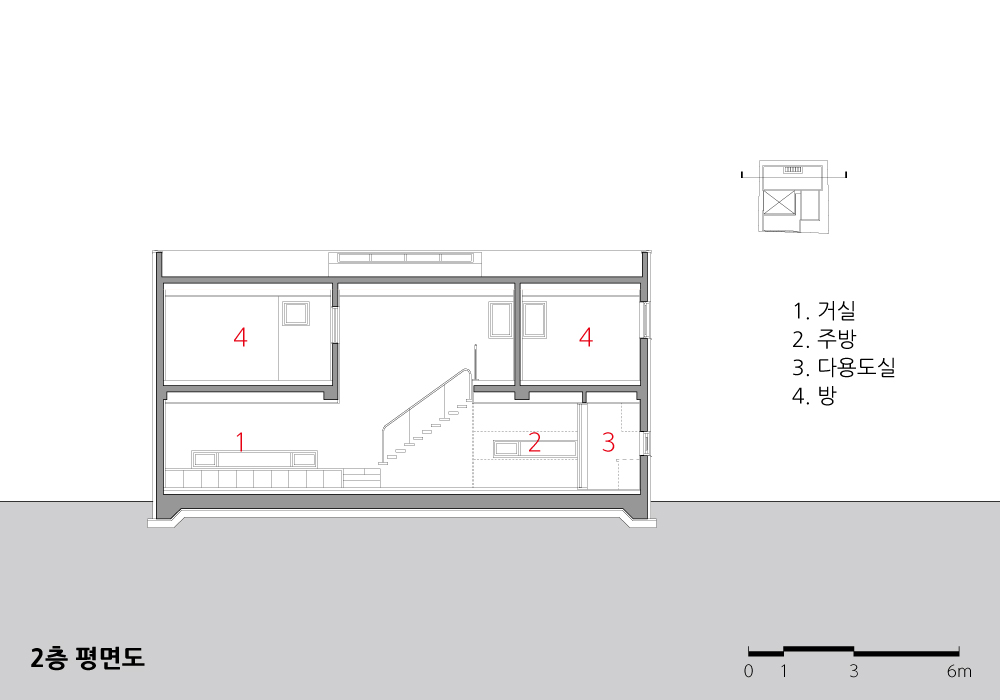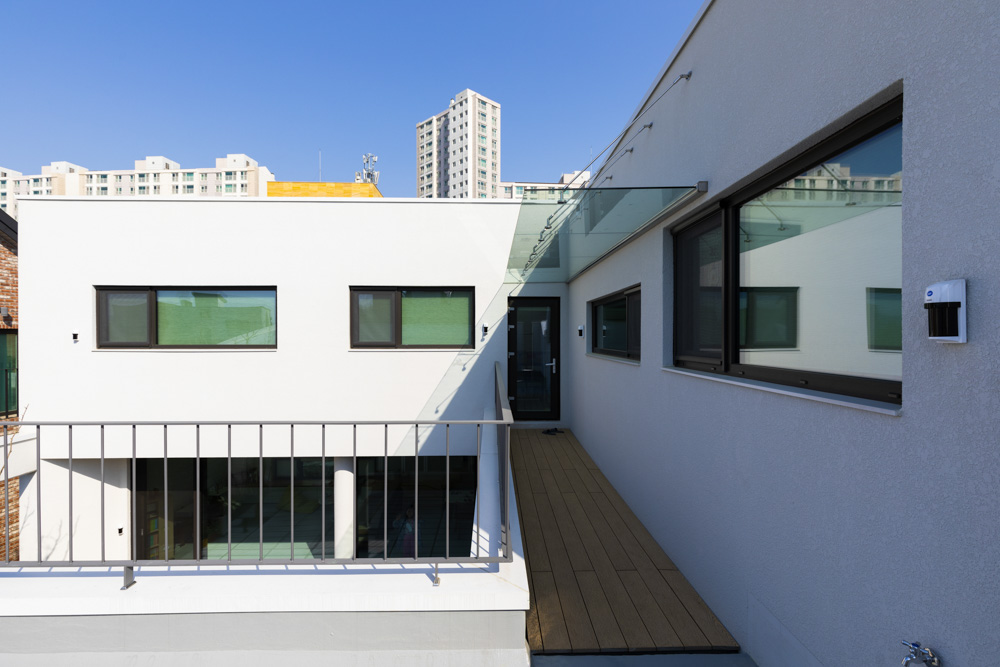 1층은 옛 살림집을 본보기 삼아 안마당-마루-실내로 연결되는 공간을 만들고, 2층에도 옥상 테라스를 만들어 옥외공간을 가깝게 사용할 수 있게 하였다.