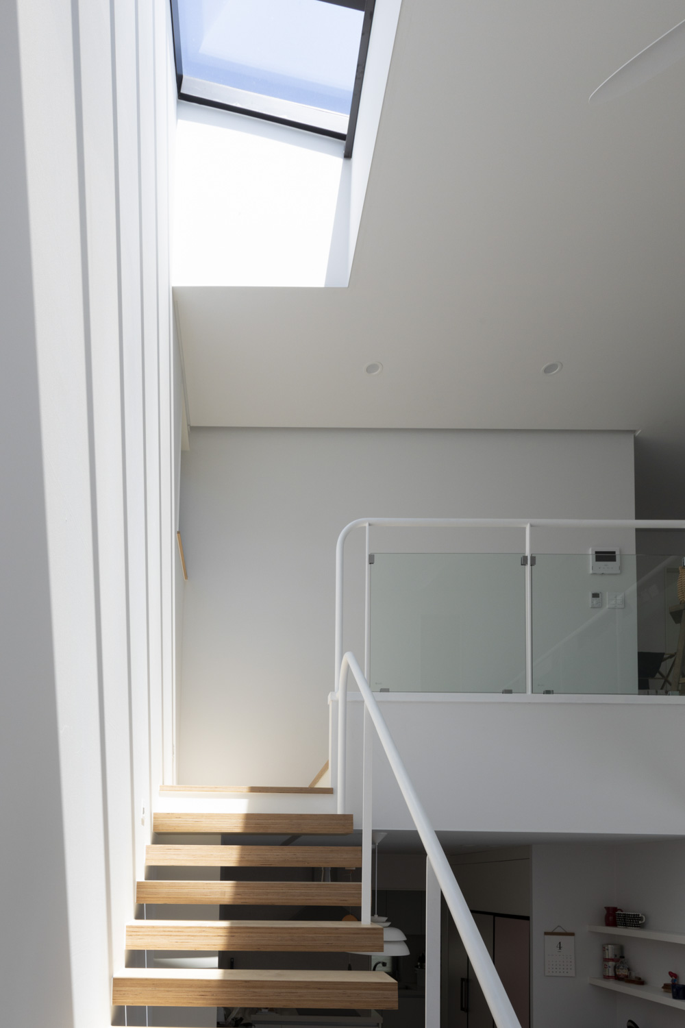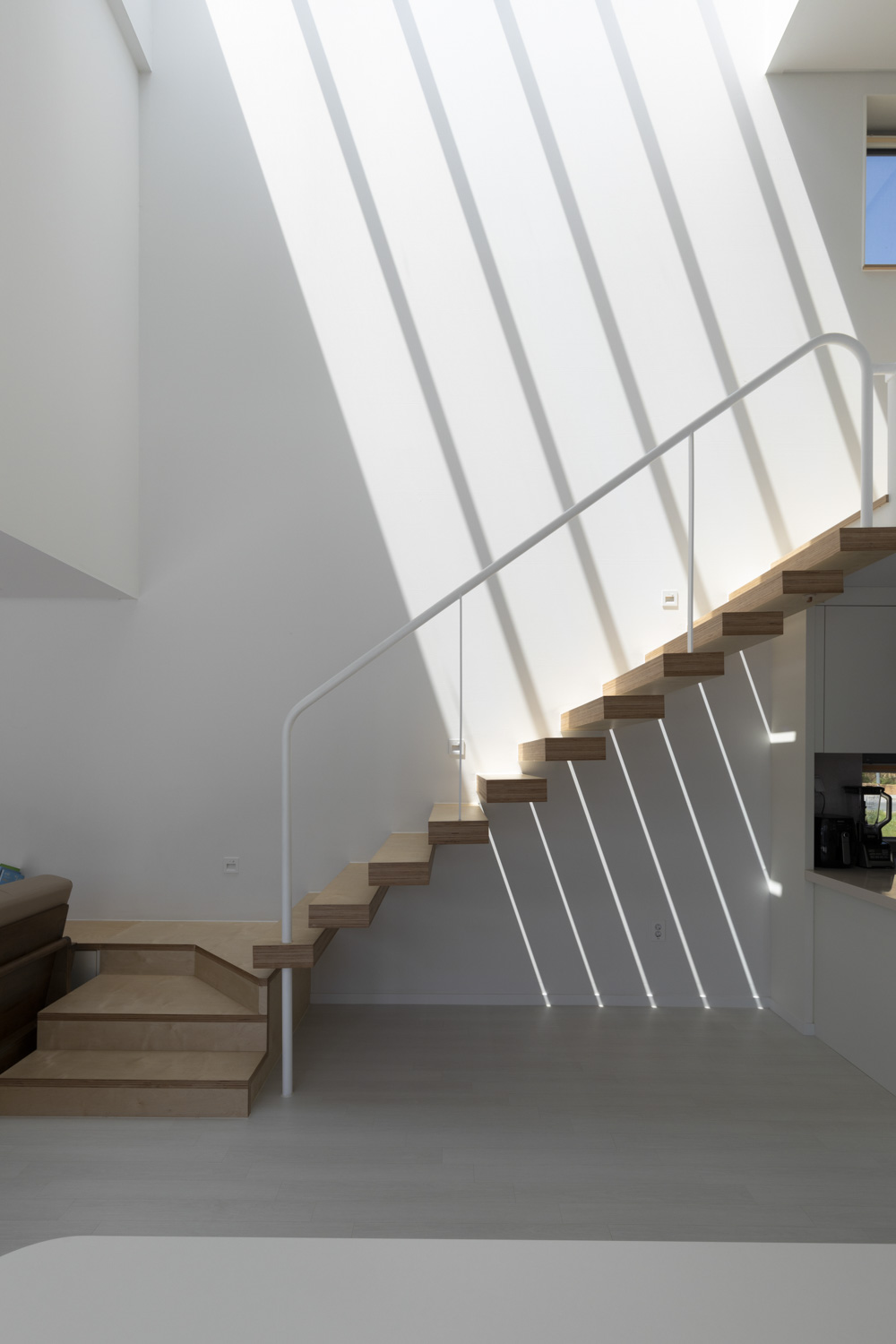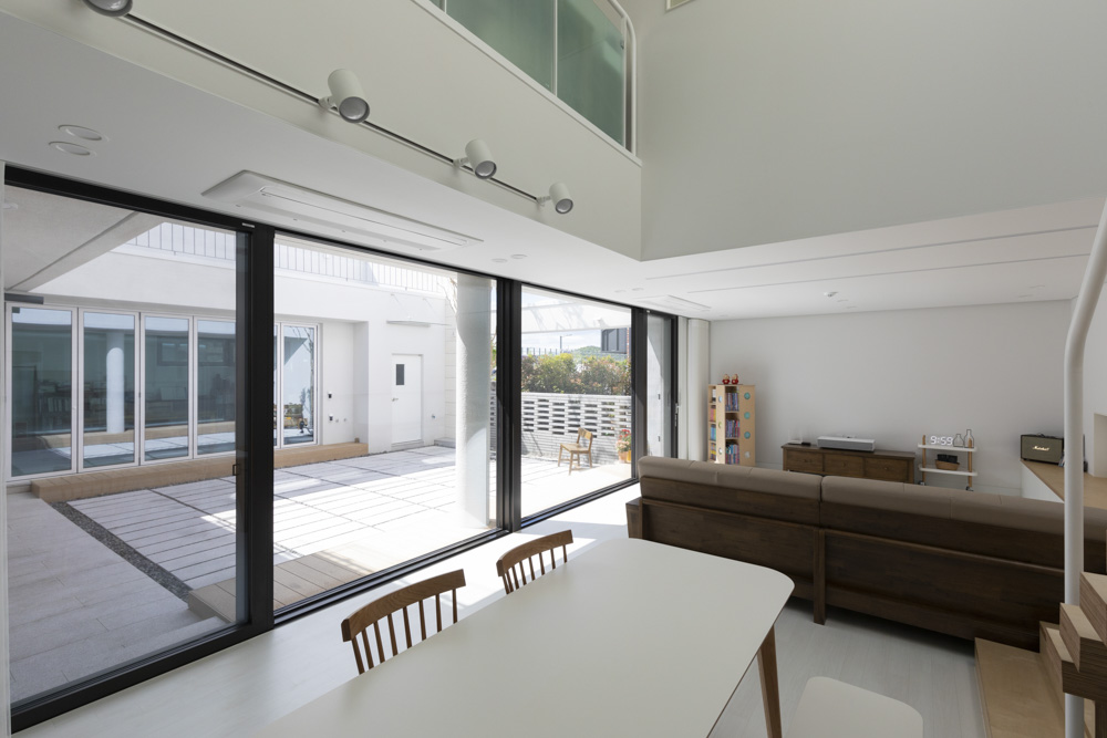 The large one is placed inside the land, and the small one is placed side by side on the roadside with 11. We connect the other small ones by floating them to the northeast between the two loaves. The three masses were joined to create an outer courtyard (piloti parking lot) and an inner courtyard. The spaces on the first floor have large windows towards the courtyard, giving a horizontal sense of expansion. The stairs going up to the second floor across the open space, and the skylight at the top induces the sunlight to create light and shadows.