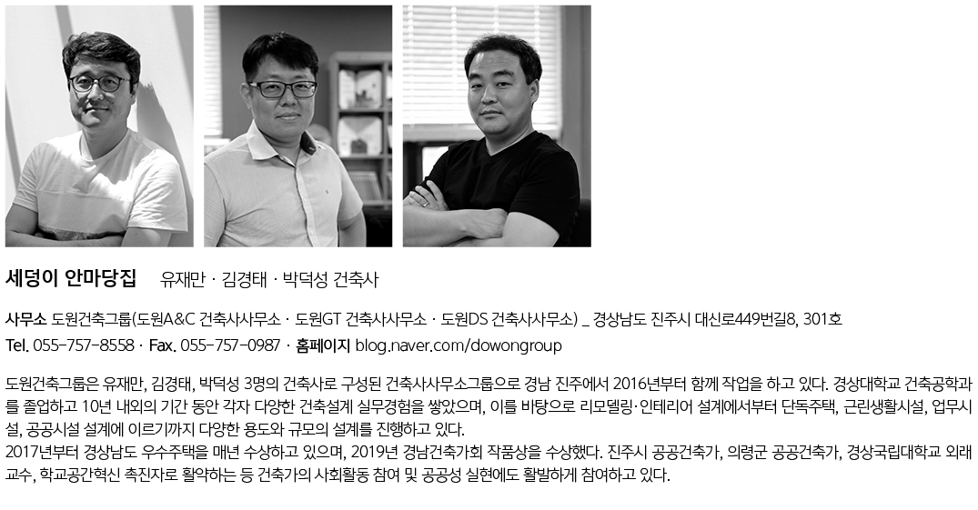 | 세덩이 안마당집 설계자 | 김재만 · 김경태 · 박덕성 _ 도원건축그룹(도원A&C 건축사사무소 · 도원GT 건축사사무소 · 도원DS 건축사사무소) 건축주 | 지주령 감리자 | 김경태 _ 도원GT 건축사사무소 시공사 | 토마건설 설계팀 | 성무석, 이유진, 신유진 대지위치 | 경상남도 진주시 사들로34번길 9-5 주요용도 | 단독주택 대지면적 | 280.80㎡ 건축면적 | 150.07㎡ 연면적 | 199.76㎡ 건폐율 | 53.67% 용적률 | 71.14% 규모 | 지상 2층 구조 | 철근콘크리트구조 외부마감재 | 라임스톤, 스타코 내부마감재 | 실크벽지, 본타일, 강마루 설계기간 | 2020. 08 - 2020. 10 공사기간 | 2020. 10 - 2021. 03 사진 | 유재만 구조분야 : 혜담구조엔지니어링 기계설비분야 : 라인엔지지어링 전기분야 : 라인엔지지어링 |