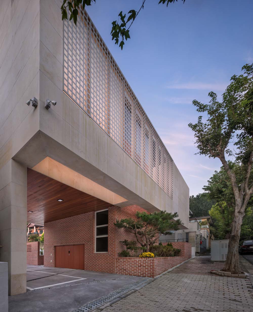 The aluminum perforated panel installed over the second floor of the road was designed to screen the interior space. Still, to remove the impression that it was cold and indifferent shown in other houses, it was intended to create a variety of street views with warm illuminance and three-dimensional forms of landscape lighting.