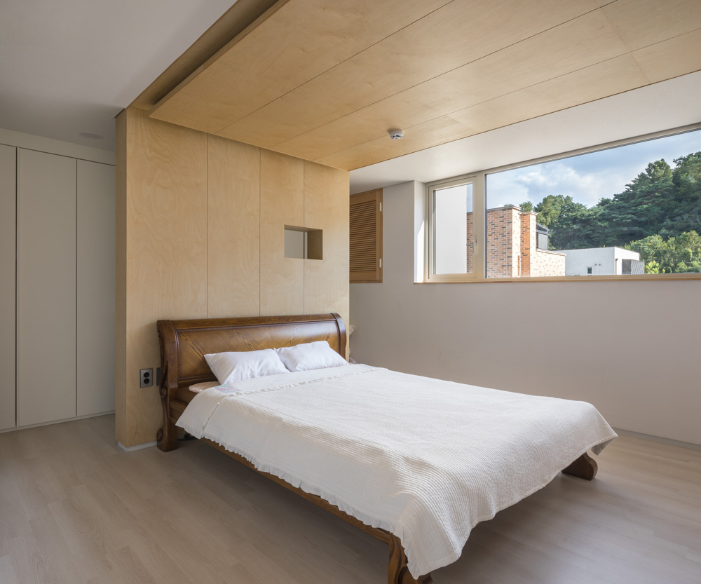 우리는 이 집이 단순히 기능적이고 편리한 공간 구성에 집중하여 그저 방들이 집합된 이쁜 덩어리로서 만족하는 것을 경계하였다. 1층 거실과 2층 복도에는 유리 바닥, 주차장과 거실 알코브 사이에는 세로로 긴 창을 두어서 공간이 시각적으로 관통되도록 하고, 방들은 다시 열린 마당으로 이어지는 순환적 구조로 구성원들 간의 교감을 유발할 수 있도록 의도하였다.