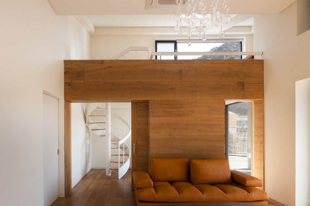 On one wall of the stairway leading to the skip floor, a 2.5 story-high bookcase is designed to be integrated with the stairway design, giving unity to the space connected to each floor. Considering the nature of the client's job who often welcomes foreign guests, we made a guest room on the first floor and planned a separate external entry route to the guest room so that it could be used according to changing lifestyle.