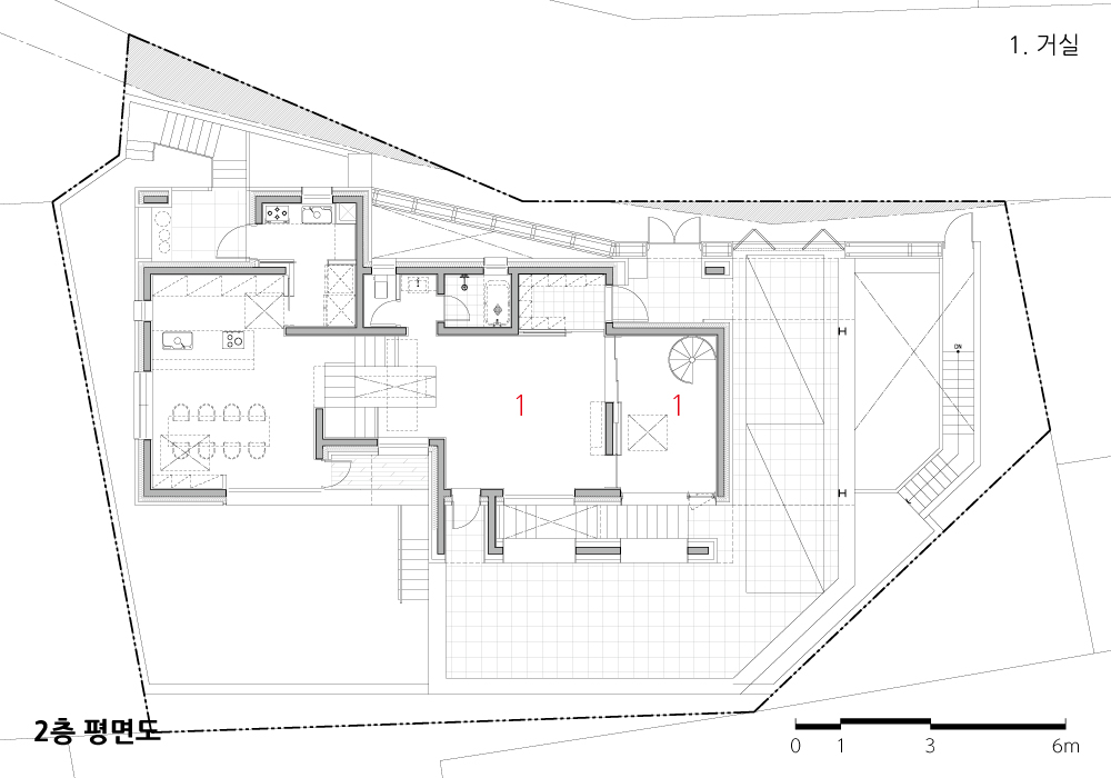 북악산 산기슭에 자리 잡은 이 대지는 북악산의 좋은 전망과 남쪽으로 열려있는 좋은 대지조건을 가진다. 북측의 인접도로보다 낮은 경사지라는 대지조건을 이용하여 도로에서 2층으로 바로 진입하는 방식을 택하였고, 이로 인해 마당에서 보면 2층이지만 도로에서 보면 단층 건물처럼 보이는, 위치에 따라 다양한 모습을 보여주는 집을 계획하였다. 이는 인접도로가 넓지 않은 상황에서 보행자의 시선에 위압감을 주는 건물이 아니라 골목 스케일의 친근한 집으로 보이고 싶은 의도에도 부합했다.