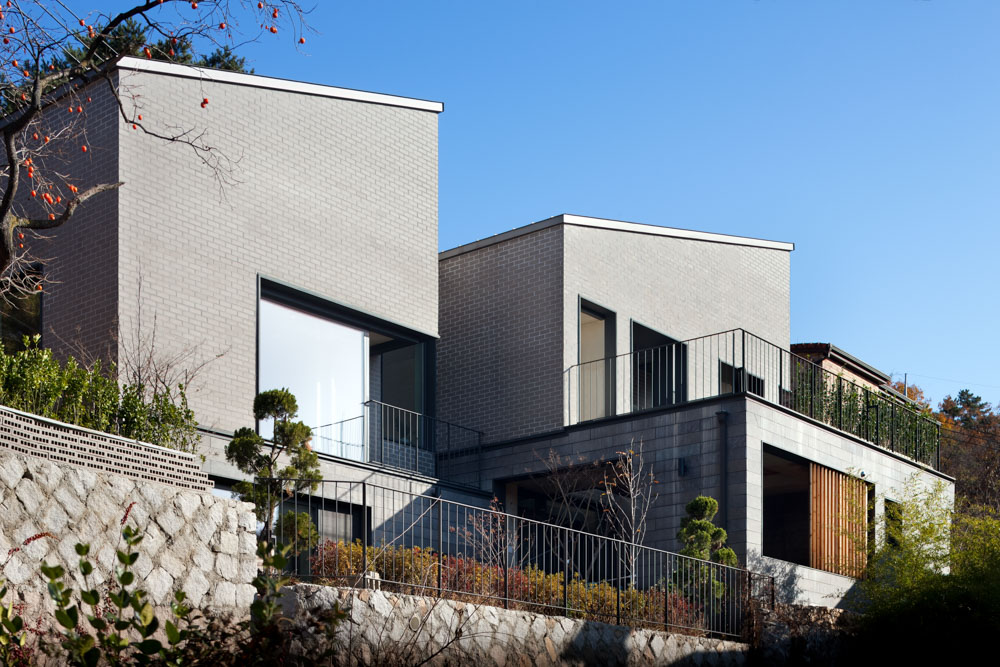 주택의 형태는 도로에서 단층으로 보이는 2층 매스가 너무 길거나 비대해 보이지 않도록 약간의 리듬감을 주어 매스를 나누었고, 북악산 기슭이라는 환경에 어울리도록 두 개의 경사지붕을 구성하여 지루하지 않도록 하였다. 외부 마감재료도 나누어 1층은 석재로 구성, 땅에 견고하게 자리 잡고 있는 안정적인 기단의 느낌을 주었고 2층은 시간이 지나도 질리지 않고 곱게 나이 드는 재료인 벽돌로 구성하여 친근한 골목길을 만들고자 했다.