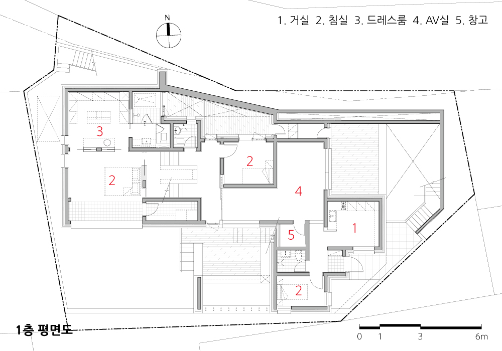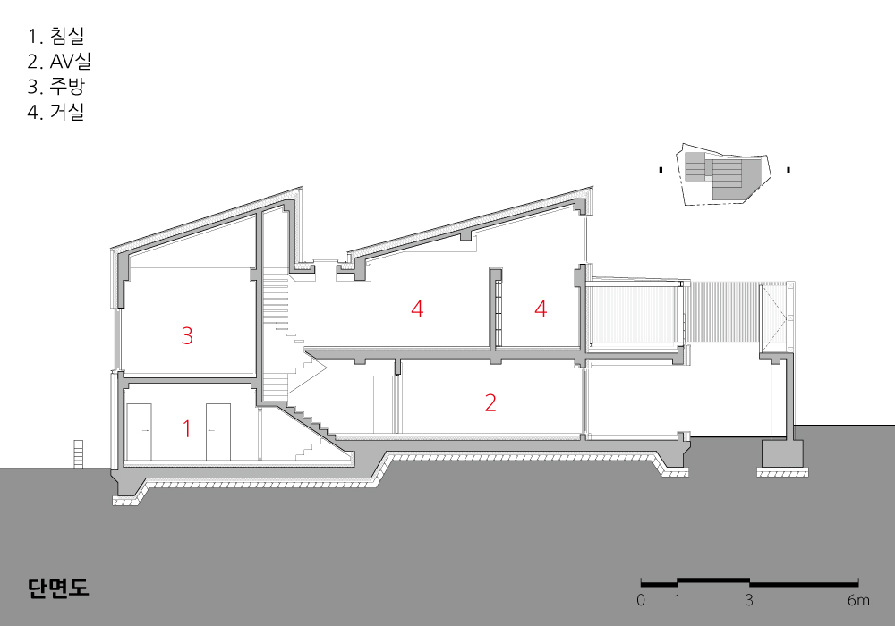 북악산 산기슭에 자리 잡은 이 대지는 북악산의 좋은 전망과 남쪽으로 열려있는 좋은 대지조건을 가진다. 북측의 인접도로보다 낮은 경사지라는 대지조건을 이용하여 도로에서 2층으로 바로 진입하는 방식을 택하였고, 이로 인해 마당에서 보면 2층이지만 도로에서 보면 단층 건물처럼 보이는, 위치에 따라 다양한 모습을 보여주는 집을 계획하였다. 이는 인접도로가 넓지 않은 상황에서 보행자의 시선에 위압감을 주는 건물이 아니라 골목 스케일의 친근한 집으로 보이고 싶은 의도에도 부합했다.