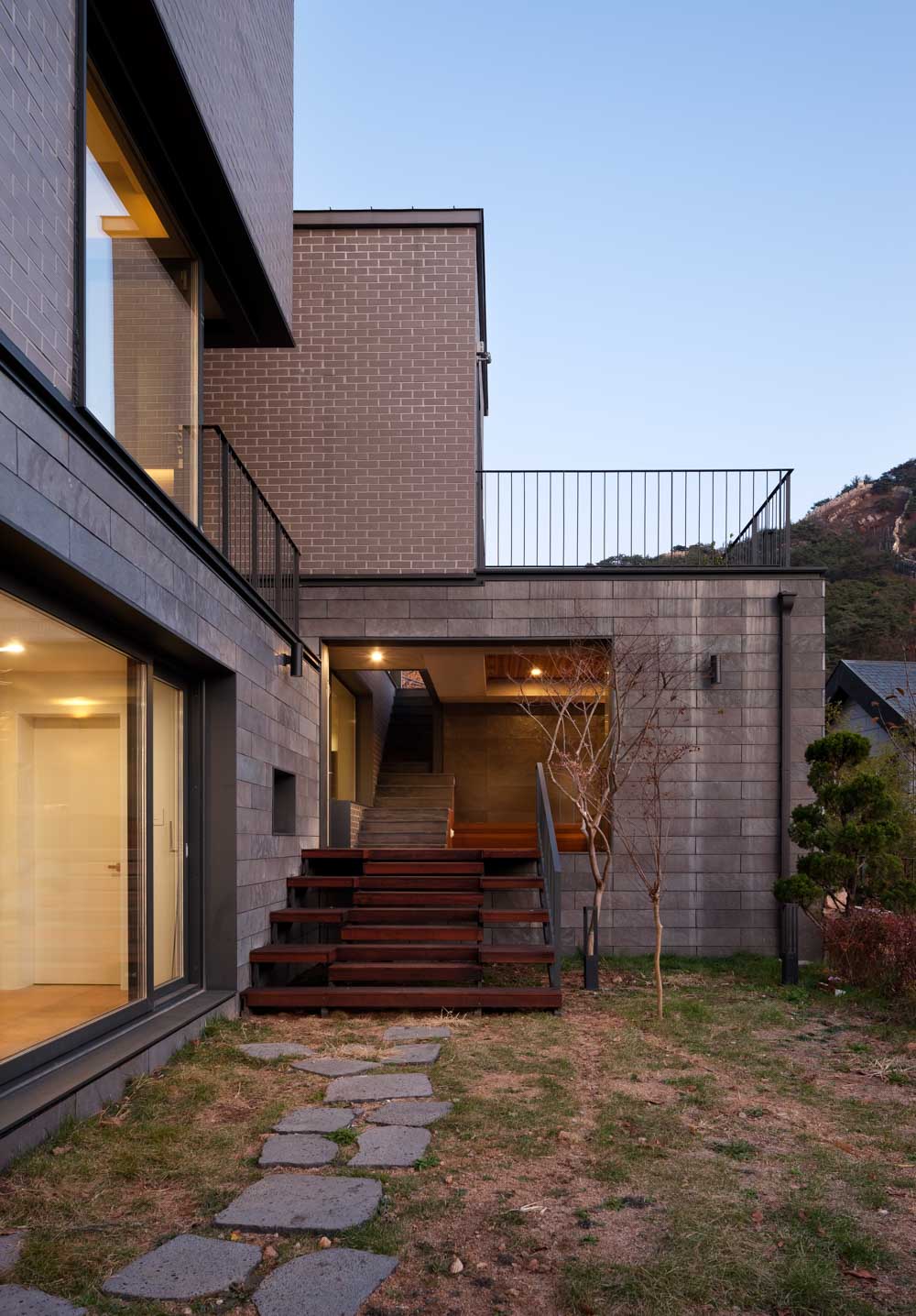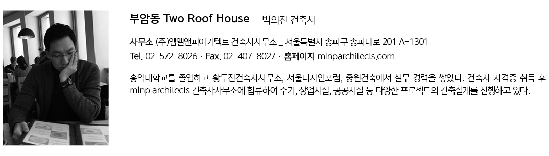 Buam-dong Two Roof House Architect | Park, Euijin · Lee, Myungho(RIBA) _ mlnp architects Client | Private Supervisor | Park, Euijin _ mlnp architects Construction | Donga A&C Location | 127, Baekseokdong-gil, Jongno-gu, Seoul, Korea Program | House Site area | 420.30㎡ Building area | 207.83㎡ Gross floor area | 297.34㎡ Building to land ratio | 49.45% Floor area ratio | 70.74% Building scope | 2F Structure | RC Exterior finishing | Wall _ Brick, Stone Roof _ THK0.5 Color Stell Plate Interior finishing | Wall – Benjamin Moore Paint Floor – SHinmyeong Flooring Wood Floor SM-OAK BR Tile – Daeje Tile District Marengo Design period | Nov. 2017 – May 2018 Construction period | May 2018 – Sep. 2019 Photograph | Park, Youngchea Structural engineer | Dream Structure Mechanical·Electrical engineer | JeongYeon Eng Fire engineer | Bokang Eng |