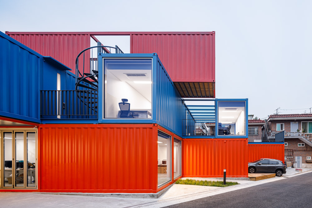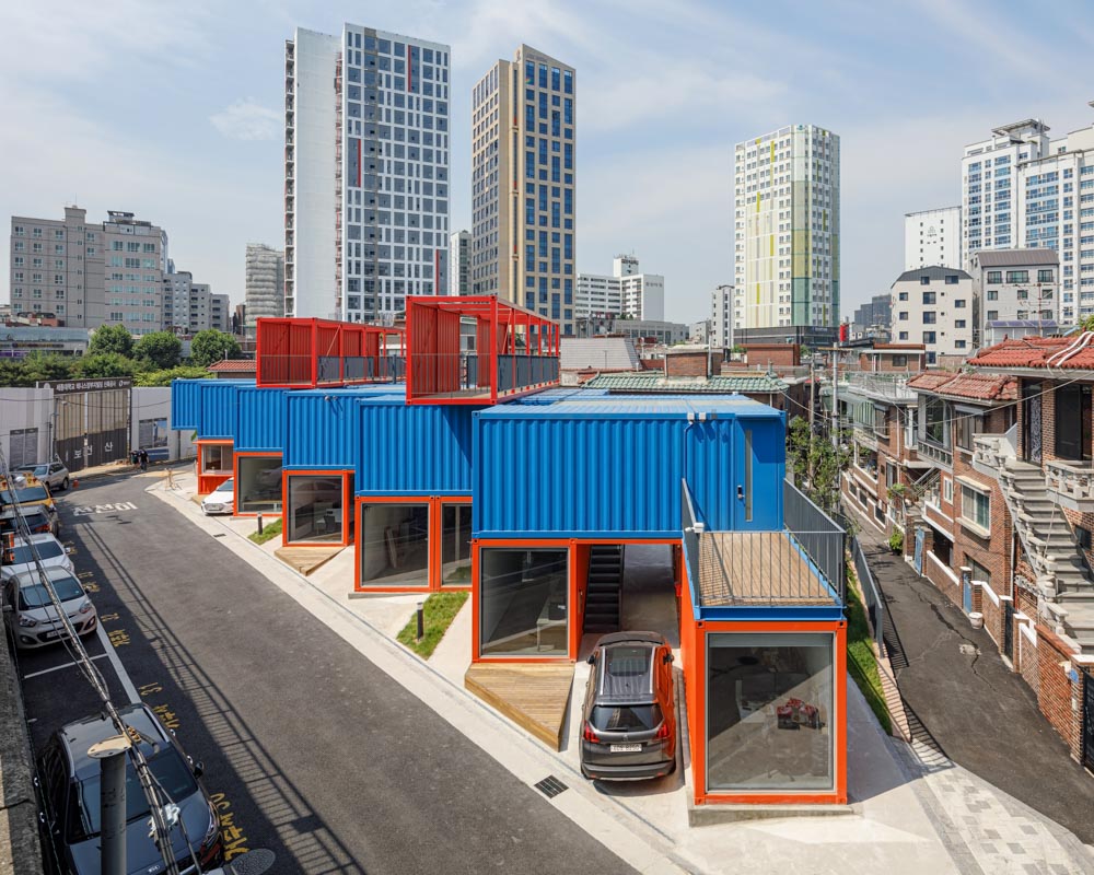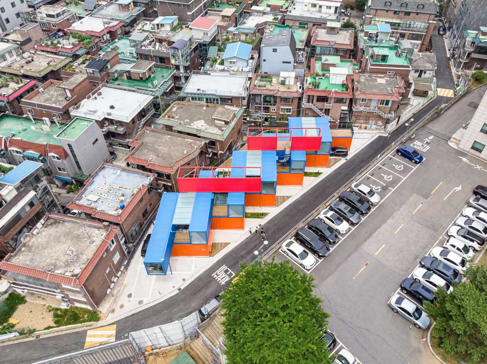대학교와 인접한 주거지는 아주 옛날부터 학교 조성을 위한 옹벽으로 단절된 상태이다. 상권의 확장과 무분별한 숙박촌의 양산으로 주민과 학생들은 다소 삭막한 길을 매일 거닐고 있다. 이곳에 수출입용 컨테이너를 활용한 건축으로 새로운 형태의 가로풍경을 만들었다. 또 사이사이 열린 외부공간과 테라스를 계획하여 만남과 휴식의 장소를 제공하였다.