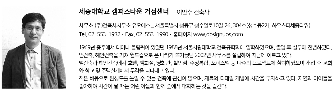 세종대학교 캠퍼스타운 거점센터 설계자 | 이만수 + 성우제 교수(AIA) _(주)건축사사무소 유오에스 · 충남대학교 건축학과 건축주 | 세종대학교 감리자 | 이만수 _ (주)건축사사무소 유오에스 시공사 | 신아주종합건설(주) 설계팀 | 박다솔, 이상운 대지위치 | 서울특별시 광진구 광나루로19길 23 주요용도 | 근린생활시설 대지면적 | 655.00㎡ 건축면적 | 279.08㎡ 연면적 | 440.79㎡ 건폐율 | 42.61% 용적률 | 67.30% 규모 | 지상 2층 구조 | 경량철골구조 외부마감재 | 골강판(컨테이너) 내부마감재 | 시멘트보드, 페인트 설계기간 | 2018. 12 - 2019. 07 공사기간 | 2019. 12 - 2020. 03 사진 | 김창묵 구조분야 : (주)하이구조 기계설비분야 : (주)코담기술단 전기분야 :(주)코담기술단 소방분야 : (주)코담기술단 |