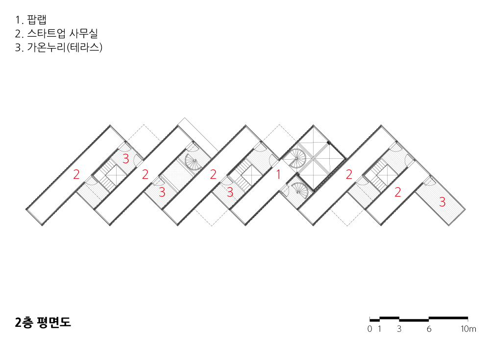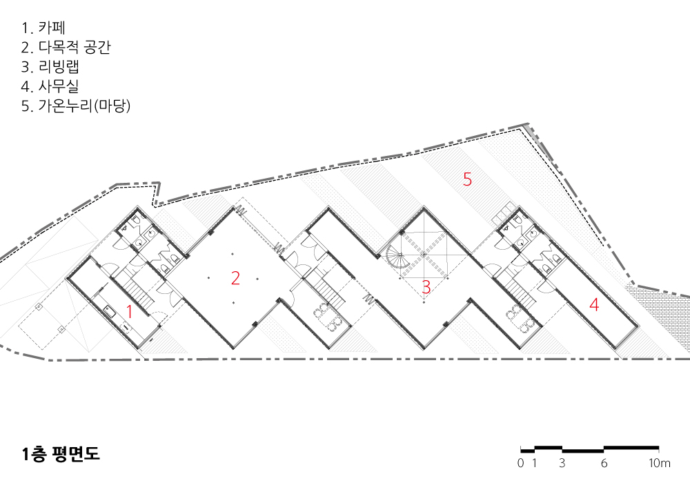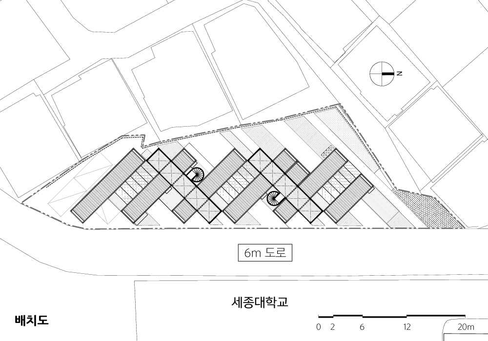 The retaining wall for school construction blocks the residential area adjacent to the university since ancient times. Due to the expansion of the commercial district and the mass production of indiscriminate lodging villages, residents and students are walking on a rather desolate road every day. New type road scenery is made with the architecture that utilizes the export and import container. In addition, the open, external space and terrace between them are planned to provide the space for meeting and relaxation.
