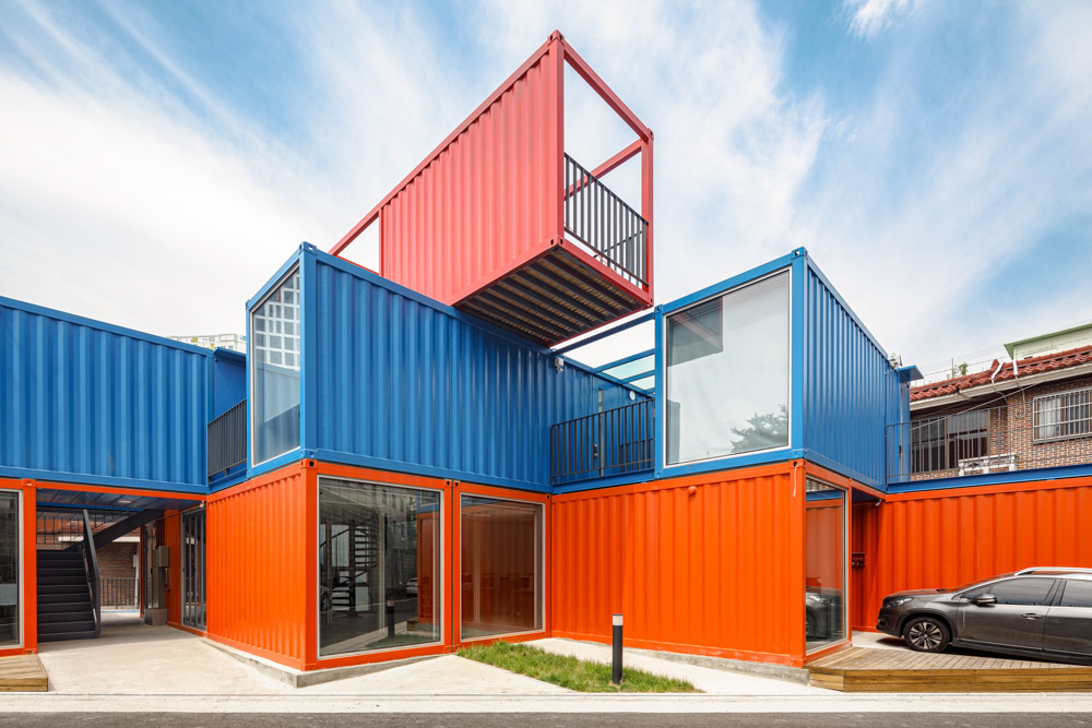 대학교와 인접한 주거지는 아주 옛날부터 학교 조성을 위한 옹벽으로 단절된 상태이다. 상권의 확장과 무분별한 숙박촌의 양산으로 주민과 학생들은 다소 삭막한 길을 매일 거닐고 있다. 이곳에 수출입용 컨테이너를 활용한 건축으로 새로운 형태의 가로풍경을 만들었다. 또 사이사이 열린 외부공간과 테라스를 계획하여 만남과 휴식의 장소를 제공하였다.