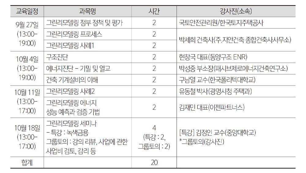 교육은 30명 인원의 집합교육 형태로 진행되며 총 교육 시간은 주1회 8시간 씩 총 40시간이다. 교육 참가비용은 10만원이며, 교육제반비용은 교육업체의 제공으로 진행될 예정이다. 교육 장소는 서울시 서초구 효령로 건축사회관 3층 세미나실이다.