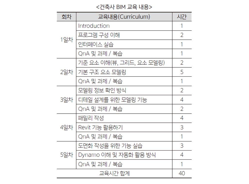 이에 대한건축사협회는 건축사들이 업무 과정에서 BIM을 더 널리 사용할 수 있도록 이번 교육과정을 마련했다. 교육내용은 지난 6월 협회의 건축사교육원 및 BIM친환경건축위원회와 협의를 거쳐 확정했으며 협회 정회원 건축사라면 누구나 신청할 수 있다.