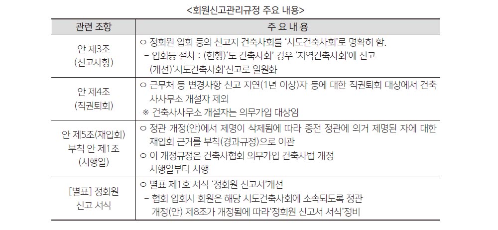 지난해 10월 15일 열린 임시총회에서 승인받은 정관 개정안에 따르면 협회 회원으로 입회하면 해당 시도건축사회에 자동 소속(가입) 된다. 이번 회원신고관리규정은 정관 개정안에 맞게 개정된 것으로 회원신고관리규정 중 입회 신고지 건축사회를 명확히 하고, 정회원 신고서 양식을 변경했다.