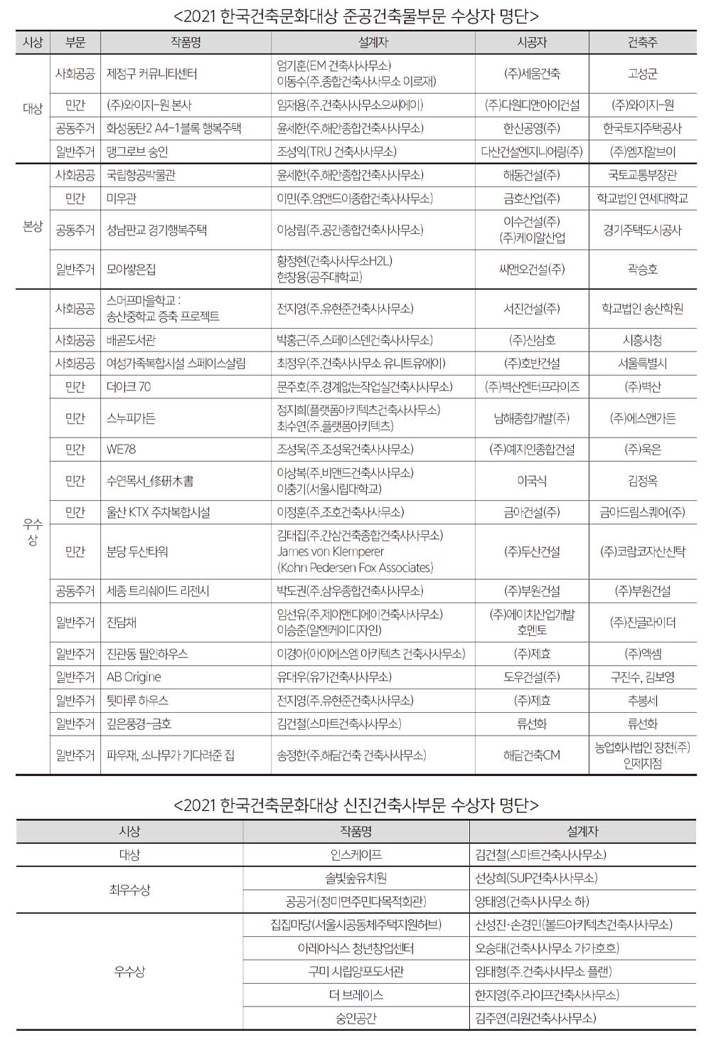 국토교통부와 대한건축사협회가 공동 주최하고 대한건축사협회가 주관하는 ‘2021 한국건축문화대상’ 각 부문 수상작이 9월 2일 발표됐다.