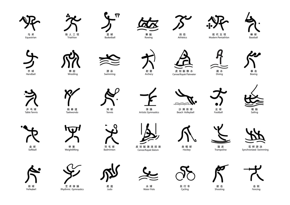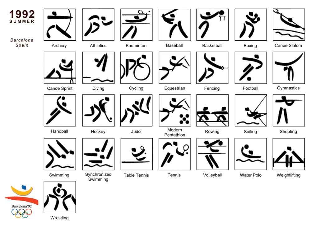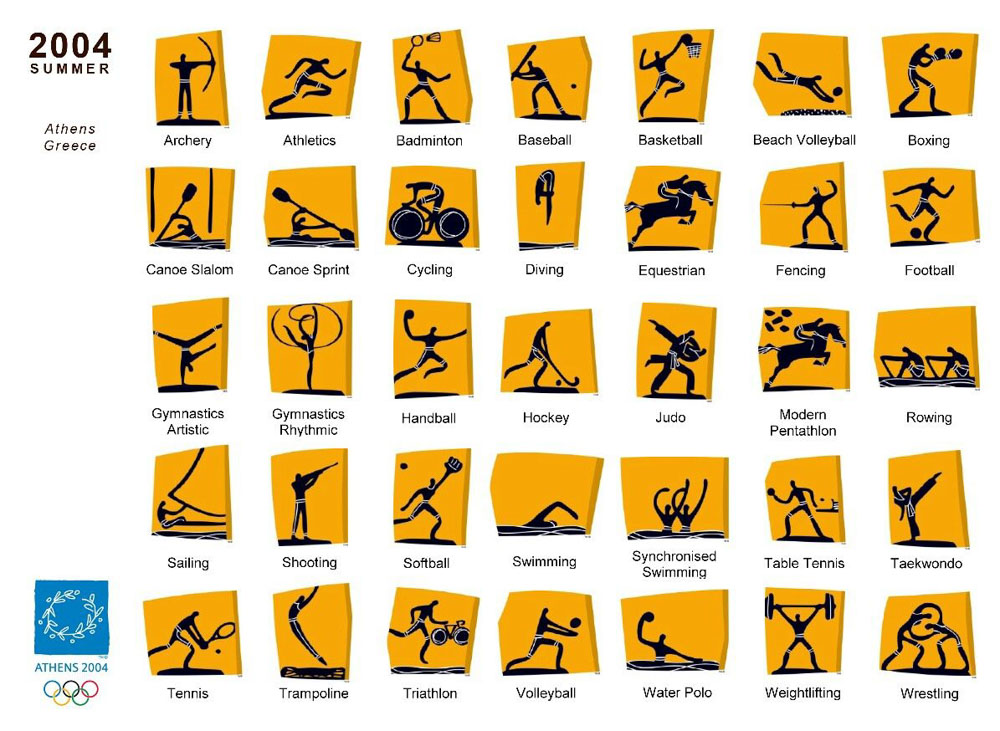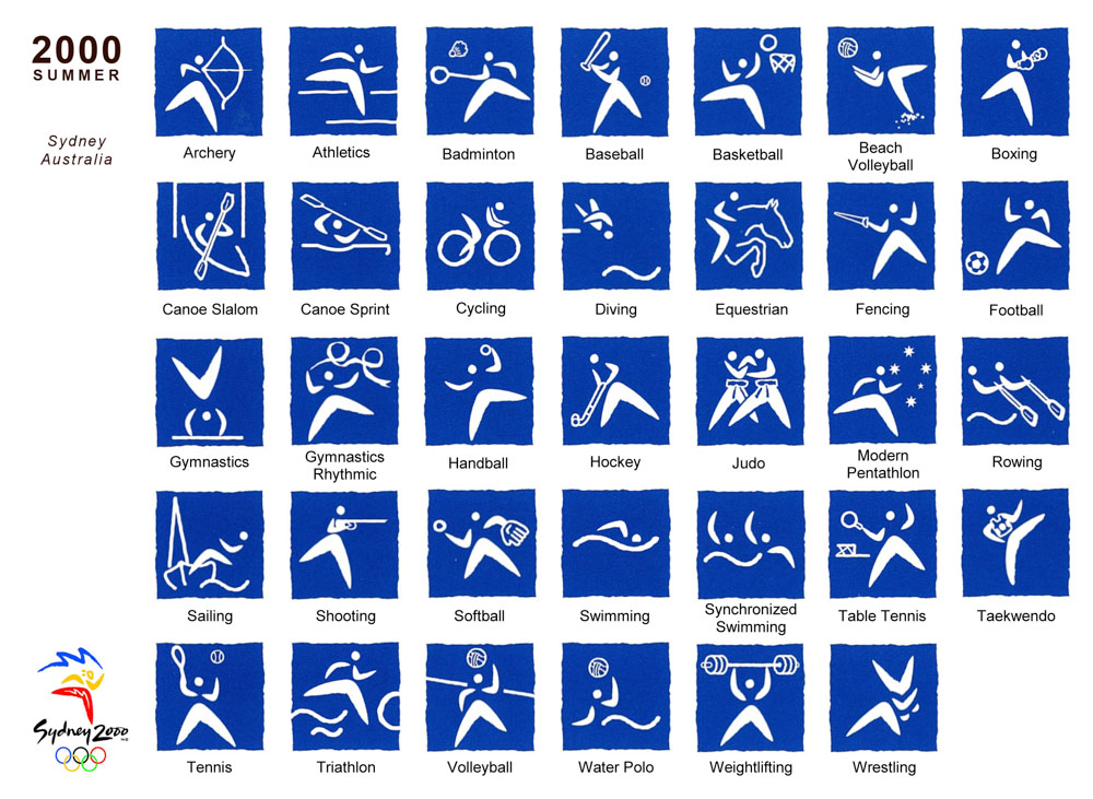 1992년 바르셀로나 올림픽부터 픽토그램 역시 로고나 마스코트만큼이나 개성을 표현하려고 했다.<사진 5> 그렇더라도 국가 상징을 넣기는 여전히 쉽지 않았다. 그러나 2000년 시드니 올림픽은 하나의 전기를 마련했다. 픽토그램에도 국가적 상징성을 부여한 것이다. 호주의 디자이너들은 원주민들이 사냥할 때 사용하는 부메랑을 기본으로 픽토그램을 디자인했다.<사진 6> 그러자 2004년 아테네 올림픽 때는 더욱 적극적으로 자국의 문화를 반영했다.<사진 7> 인간의 형체는 고대 그리스 군도 키클라데스 문명의 조각에서 가져왔고, 오렌지색 바탕에 검은색 그림은 고대 그리스 꽃병의 그림 양식을 가져온 것이다. 2008년 베이징 올림픽은 중국 전통의 도장 문자 형태를 빌려왔다.<사진 8>