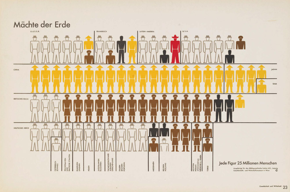 오스트리아의 사회학자인 오토 노이라트는 현대 그림문자의 선구자다. 그는 제1차 세계대전이 끝난 뒤 일어난 유럽 사회의 엄청난 변화를 고등교육을 받지 않는 사람들도 알 필요가 있다고 생각했다. 사회 변화는 통계자료를 통해 알 수 있다. 그리하여 그는 각종 복잡한 통계들을 그림문자를 이용해 누구나 쉽게 알아볼 수 있도록 하는 정보 전달 시스템을 개발했다. 그것을 아이소타이프(ISOTYPE: International System of Typographie Picture Education, 문자적 그림 교육의 국제 체계)라고 불렀다. ‘국제 체계’라는 말에 주목할 필요가 있다.<사진 2> 이것은 특정 나라의 기호가 아니라 ‘보편적’ 언어임을 강조한 것이다. 노이라트와 협력한 디자이너 게르트 아른츠는 통계를 한눈에 알 수 있도록 추상화된 인물을 표현했다. 이것이 20세기 모던 픽토그램 속 ‘스틱맨’의 출발이다. 노이라트와 아른츠가 디자인한 픽토그램으로 표현한 통계자료는 현대 인포그래픽의 선구라고 할 수 있다. 이것은 문맹자 또는 문해력이 떨어지는 계층뿐만 아니라 고등교육을 받은 사람들에게도 환영받았다.
