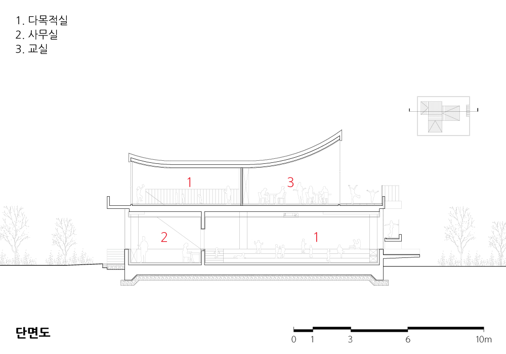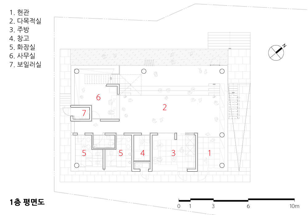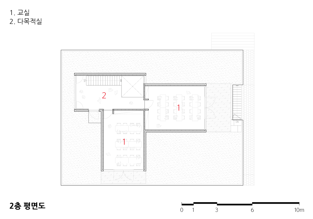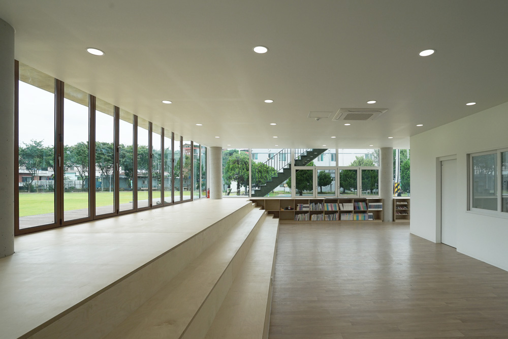 이 공간은 물리적 투명함과 개방감을 통해 지역과의 열린 관계를 만들고자 하였다. 또한 내부와 외부 사이에 높이가 다르고 지붕이 있는 외부공간을 두어 센터의 아이들과 지역의 주민들이 공유하는 공간을 만들고자 하였다.