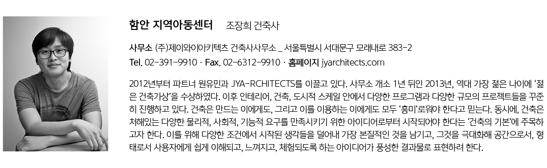 | 함안 지역아동센터 설계자 | 조장희 _ (주)제이와이아키텍츠 건축사사무소 건축주 | 사회복지법인밀알복지재단 감리자 | 조장희 _ (주)제이와이아키텍츠 건축사사무소 시공사 | JD건축 설계팀 | 성지은, 안현희, 강종수 대지위치 | 경상남도 함안군 군북면 함마대로 766 주요용도 | 지역아동센터 대지면적 | 5,821.00㎡ 건축면적 | 218.90㎡ 연면적 | 266.59㎡ 건폐율 | 17.17% 용적률 | 20.91% 규모 | 지상 2층 구조 | 철근콘크리트구조 외부마감재 | 콘크리트노출, 종석뜯기, 아스팔트슁글 내부마감재 | 라왕합판, 라왕각재 루버, 석고보드 위 백색도장 설계기간 | 2019. 05 – 2019. 11 공사기간 | 2019. 12 – 2020. 08 사진 | 원유민 _ (주)제이와이아키텍츠 건축사사무소 구조분야 : 한길구조 엔지니어링 기계설비분야 : 정연 엔지니어링 전기분야 : 정연 엔지니어링 소방분야 : 정연 엔지니어링 |