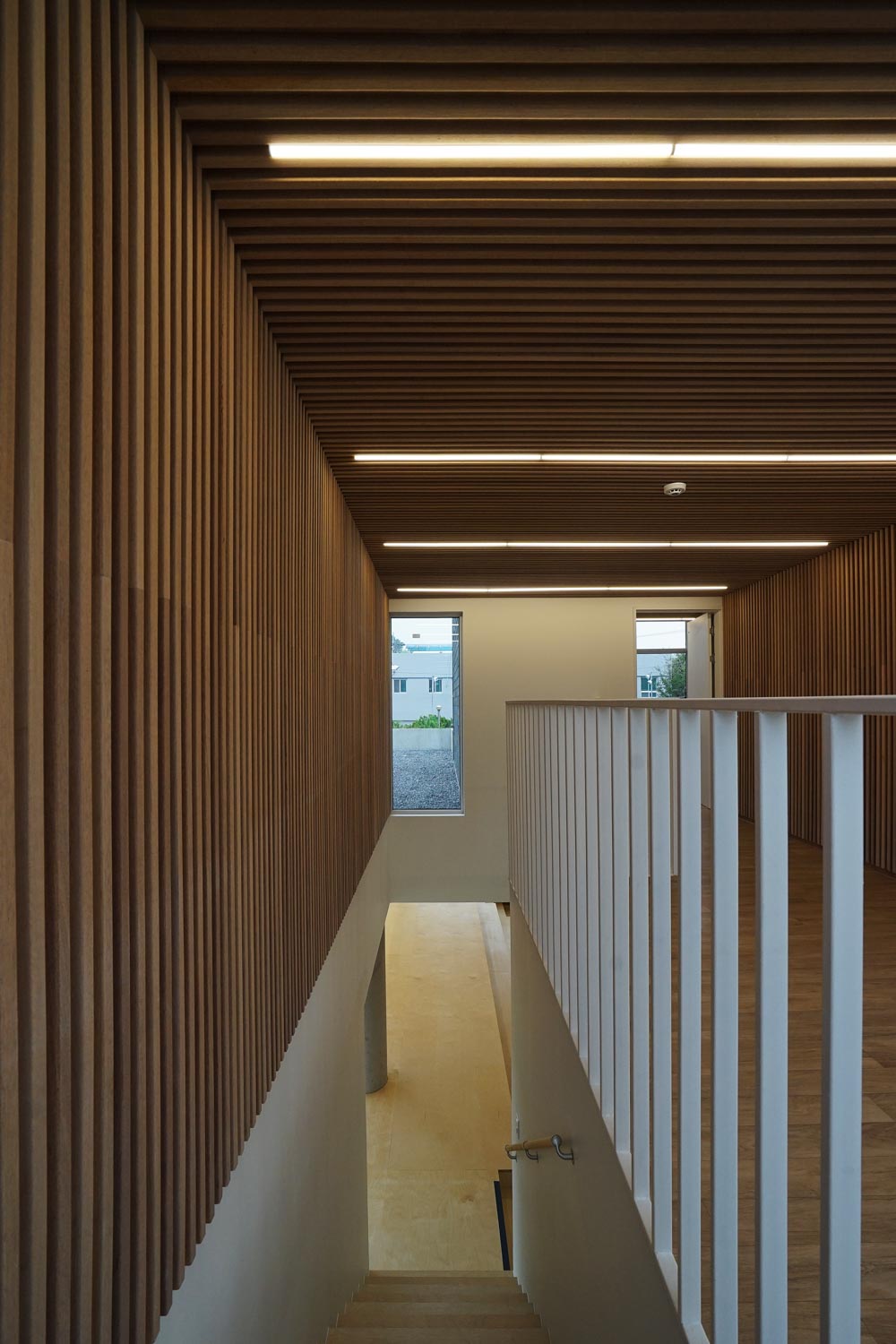 The second is a large roof. This roof covers the dazzling sunlight, gives a cool shadow for the ground floor, and protects from rain. Moreover, the interior and exterior spaces on the first floor are available, regardless of the weather.