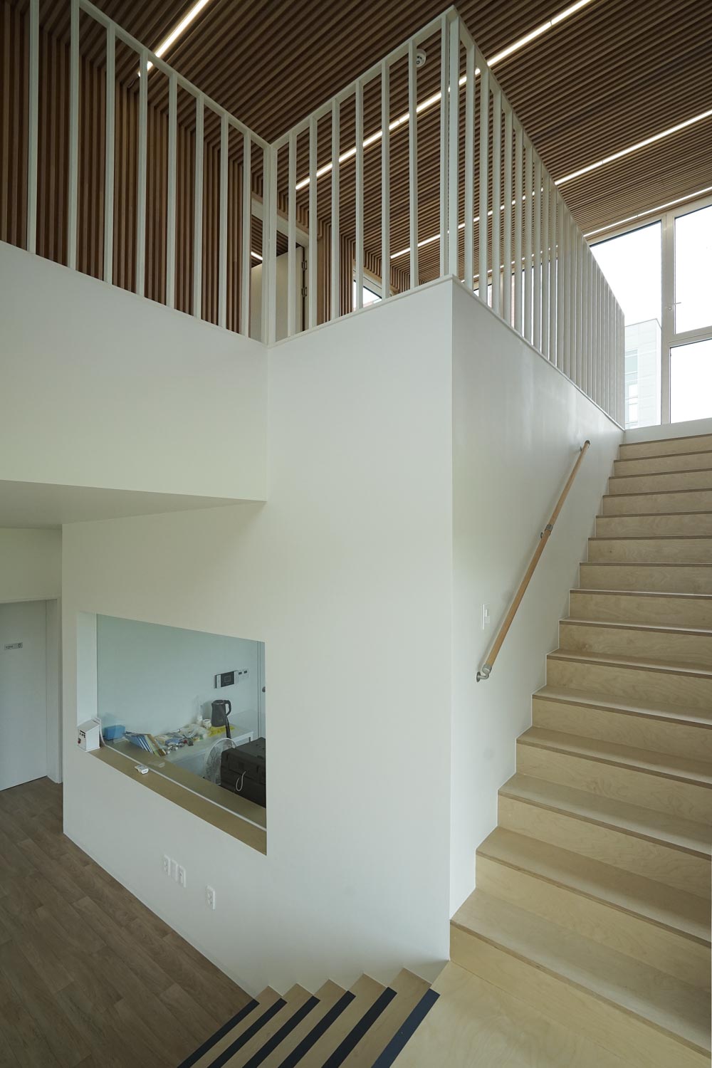 The local children's care center has a transparent and open space structure in all four directions. This opens up the sports field and surrounding green area, and playground. Moreover, the window of the second-floor studying rooms is designed to open toward the direction where you can see big trees nearby, allowing the studying space to be green.