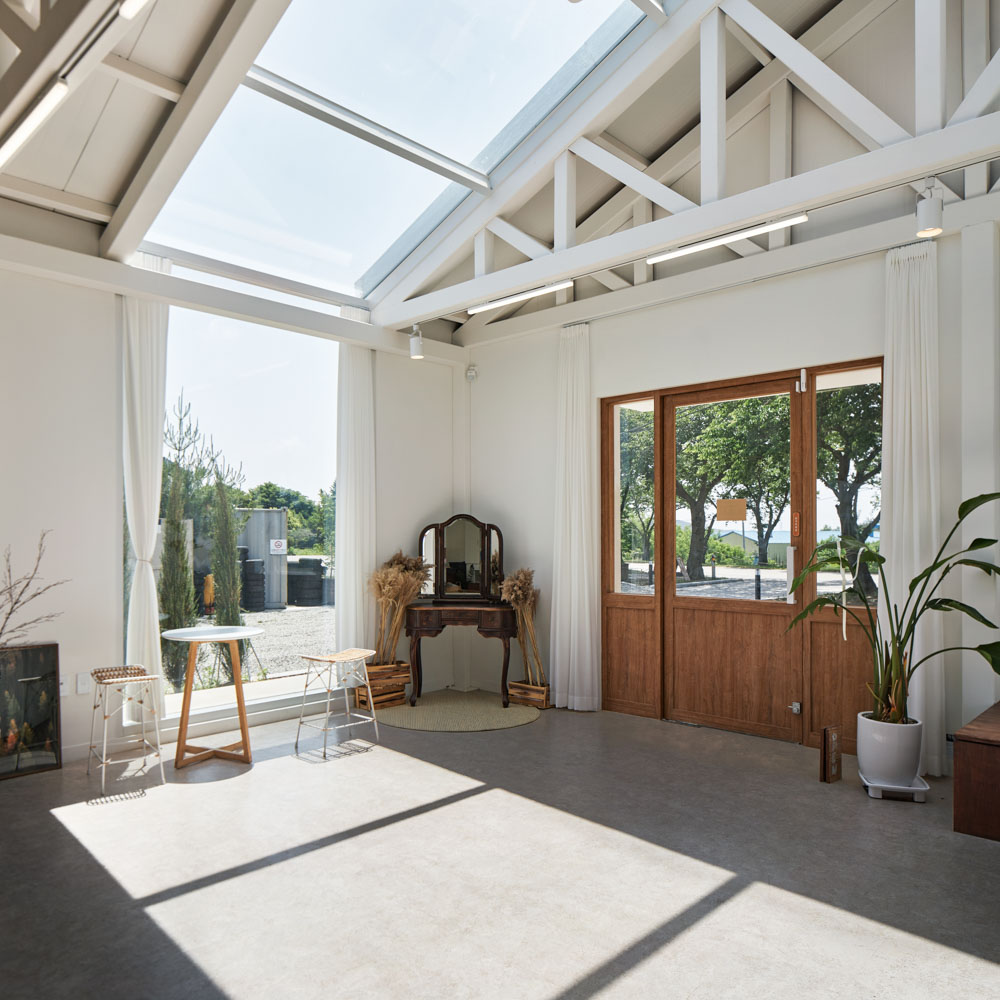 By minimizing the finish on a simple white-colored structure, the maximum sense of space that can be felt on the structure itself was secured, and the contrasting wood furniture and plants were combined to form an interior.