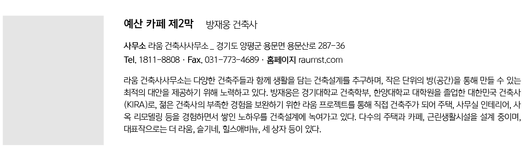 | 예산 카페 제2막 설계자 | 방재웅 _ 라움 건축사사무소 건축주 | 정제성 감리자 | 방재웅 _ 라움 건축사사무소 시공사 | 위드라움 설계팀 | 박세영 대지위치 | 충청남도 예산군 삽교읍 충의로127 주요용도 | 제1종근린생활시설(휴게음식점) 대지면적 | 1,041.00㎡ 건축면적 | 164.00㎡ 연면적 | 164.00㎡ 건폐율 | 15.75% 용적률 | 15.75% 규모 | 지상 1층 구조 | 경량철골구조 외부마감재 | 스타코 마감 내부마감재 | 수성페인트 도장마감 설계기간 | 2020. 06 – 2020. 09 공사기간 | 2020. 10 - 2020. 12 사진 | 이한울 구조분야 : (주)이든구조컨설턴트 기계설비분야 : 코담기술단 전기분야 : 코담기술단 소방분야 : 코담기술단 |