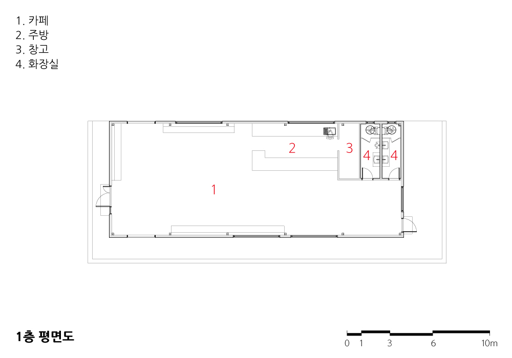 영업 시설로서 164제곱미터의 작은 내부 공간을 보완하기 위해 마당과 주변 경관을 활용한 야외공간을 연계하도록 계획하고, 각각의 공간에 색상과 재료를 다르게 하여 방문자들이 지루함을 느끼지 못하도록 영역을 구분하였다.