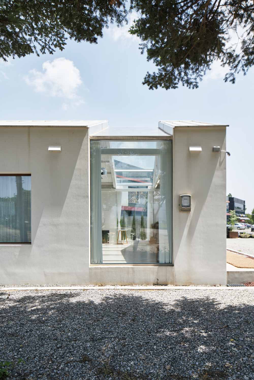 국도에 접한 대지의 길이가 좁아 건축물의 인지성을 향상시키기 위해 박공 모양의 통창을 계획하여 야간에 조명이 주는 시선 이동을 유도하였고, 이를 통해 실내 자연광을 유입하여 채광이 풍부한 실내공간을 연출하였다.