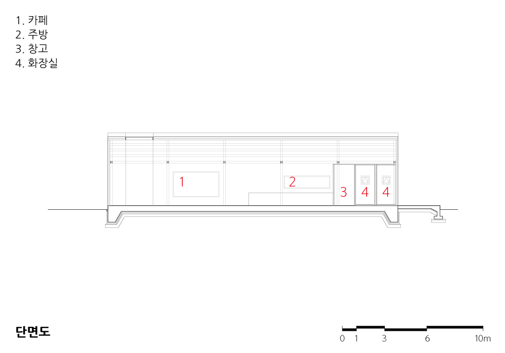 영업 시설로서 164제곱미터의 작은 내부 공간을 보완하기 위해 마당과 주변 경관을 활용한 야외공간을 연계하도록 계획하고, 각각의 공간에 색상과 재료를 다르게 하여 방문자들이 지루함을 느끼지 못하도록 영역을 구분하였다.