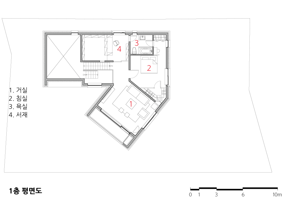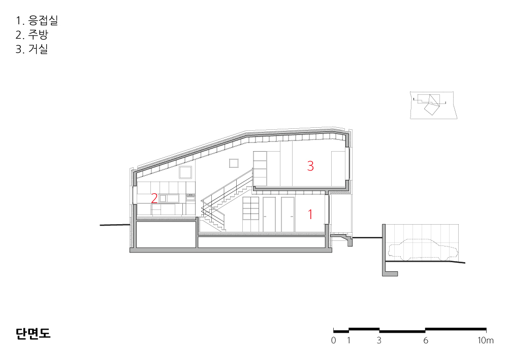 남동향에서 북서향으로 가로지르는 건물의 중심축은 수평, 수직으로 비워져 있으며 집의 성격을 보여주는 과정적 공간이다. 출입구에서부터 2층 거실까지의 비워진 내부 공간은 현관, 복도, 응접실, 계단의 주 동선을 따라 빛과 풍경, 스케일 변화에 의한 다양한 공간의 체험을 유도하며, 해가 지면 외부에 보여지는 외적 내부 공간으로 변한다.