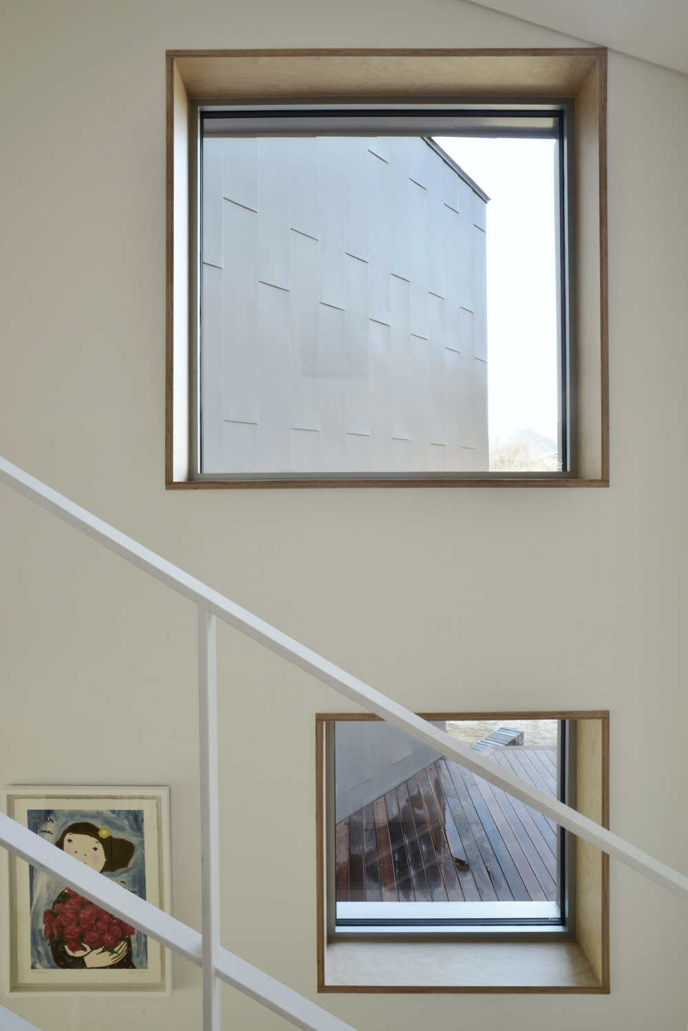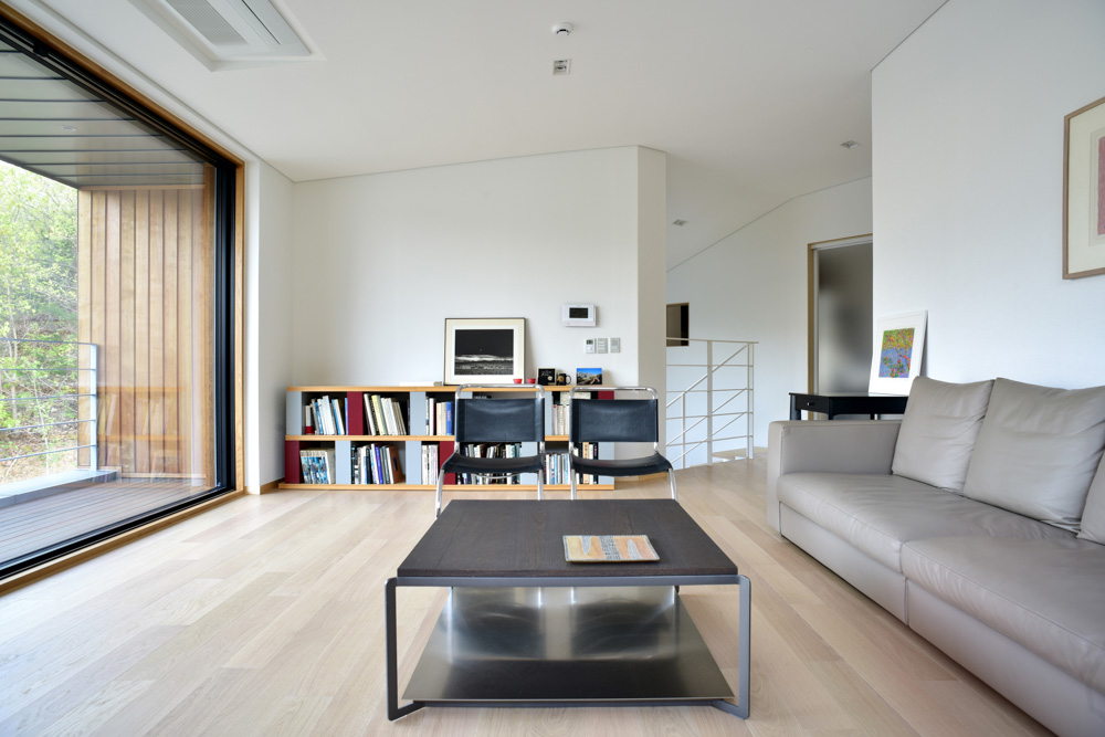 The landscape around the land that looks like a watercolor painting fills full through four large and small windows, and dazzling sunlight pours into the building from early morning until sunset, shining simple walls, floors, and furniture. The windows allow the natural wind, which circulates in the building and then emits naturally.