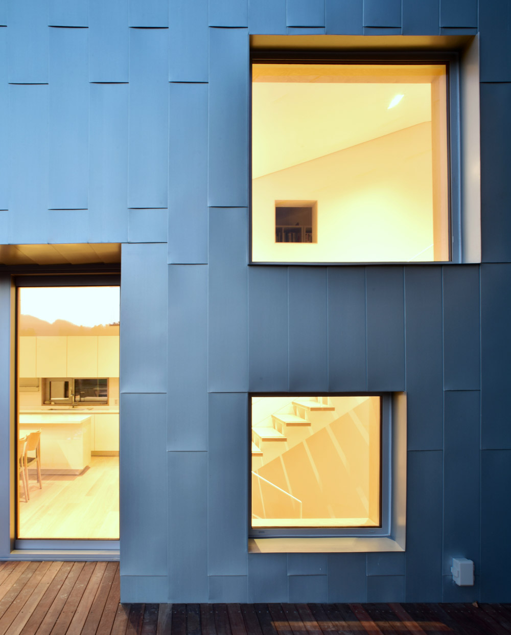 The building's central axis, which crosses from the southeast to the northwest, is horizontally and vertically empty and is a space that shows the house's characteristics. The open interior space from the entrance to the living room on the second floor leads to the various experiences of light, scenery, and scale changes along the main path of the entry, hallway, reception room, and stairs. It turns into an external interior space seen outside after sunset.