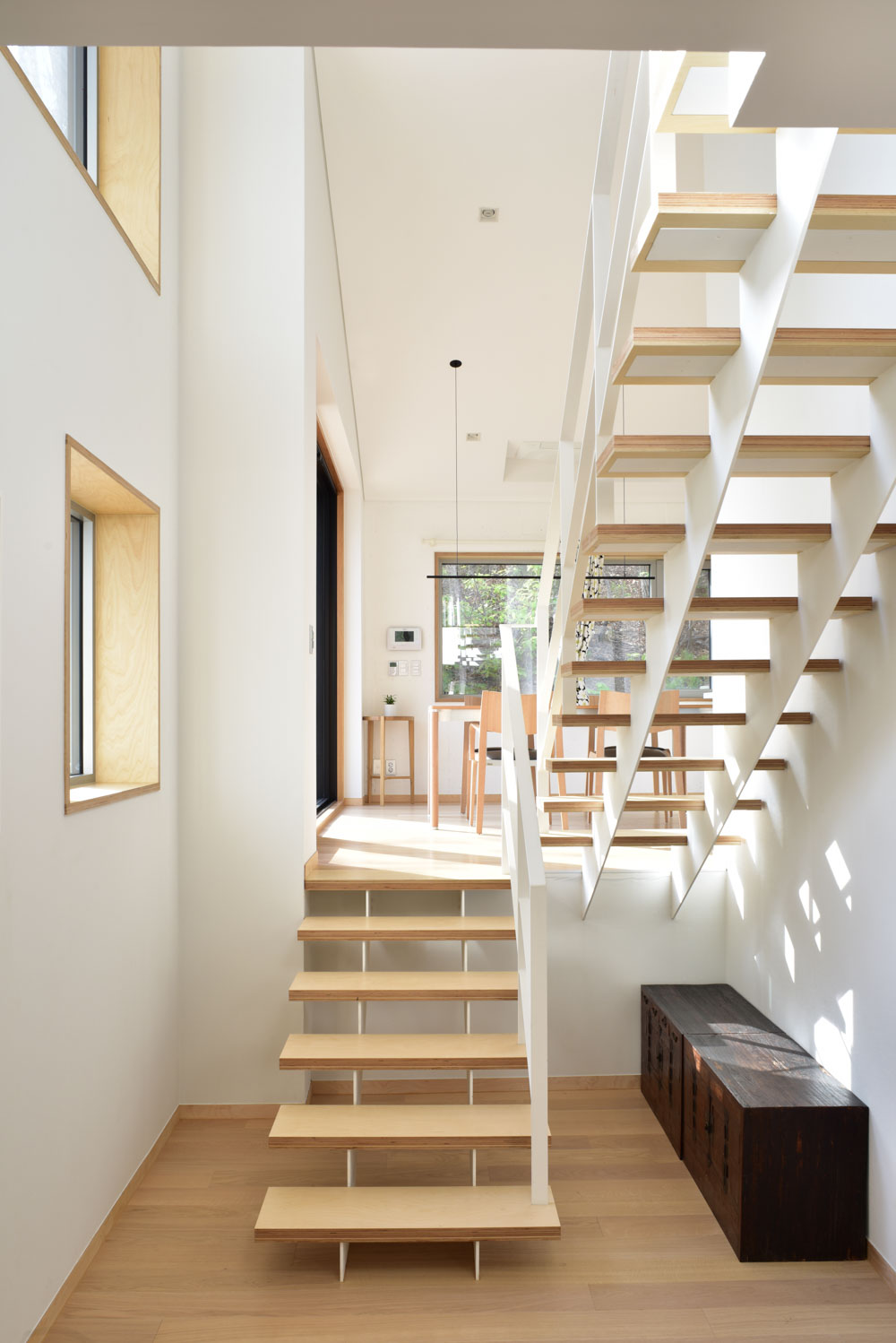 The central axis of the building, which crosses from the southeast to the northwest, is horizontally and vertically empty and is a space in a process that shows the characteristics of the house. The empty interior space from the entrance to the living room on the second floor leads to the various experiences of light, scenery, and scale changes along the main path of the entrance, hallway, reception room, and stairs, and turns into an external interior space seen outside after sunset.