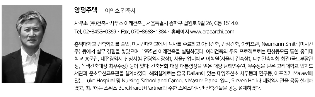 | 양평주택 설계자 | 이인호 _ (주)건축사사무소 이래건축 건축주 | 김인춘 감리자 | 이인호 _ (주)건축사사무소 이래건축 시공사 | 김인춘 설계팀 | 이은미, 권혜지 대지위치 | 경기도 양평군 서종면 문호리 주요용도 | 단독주택 대지면적 | 500.00㎡ 건축면적 | 119.80㎡ 연면적 | 175.50㎡ 건폐율 | 23.96% 용적률 | 35.10% 규모 | 지상 2층 구조 | 철근콘크리트구조 외부마감재 | - 건물 외벽 : 0.7mm 티타늄 징크판, 적삼목 - 창호 : THK 38mm 로이 삼중유리 - 지붕 : THK 0.7mm 티타늄 징크판 내부마감재 | - 벽 : 석고보드 2겹 위 실크벽지 - 천장 : 석고보드 위 친환경페인트 - 바닥 : 온돌마루 설계기간 | 2020. 03 - 2020. 08 공사기간 | 2020. 09 - 2021. 02 사진 | 이인호 구조분야 : SQ엔지니어링(주) 기계설비분야 : (주)노스타엔지니어링 전기·통신분야 : (주)전기설계·협인 |