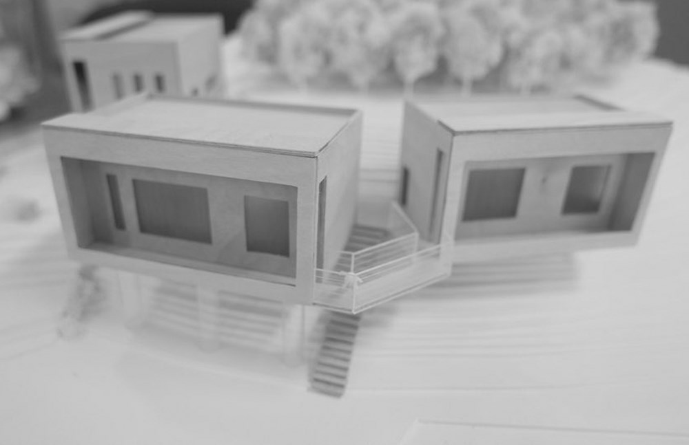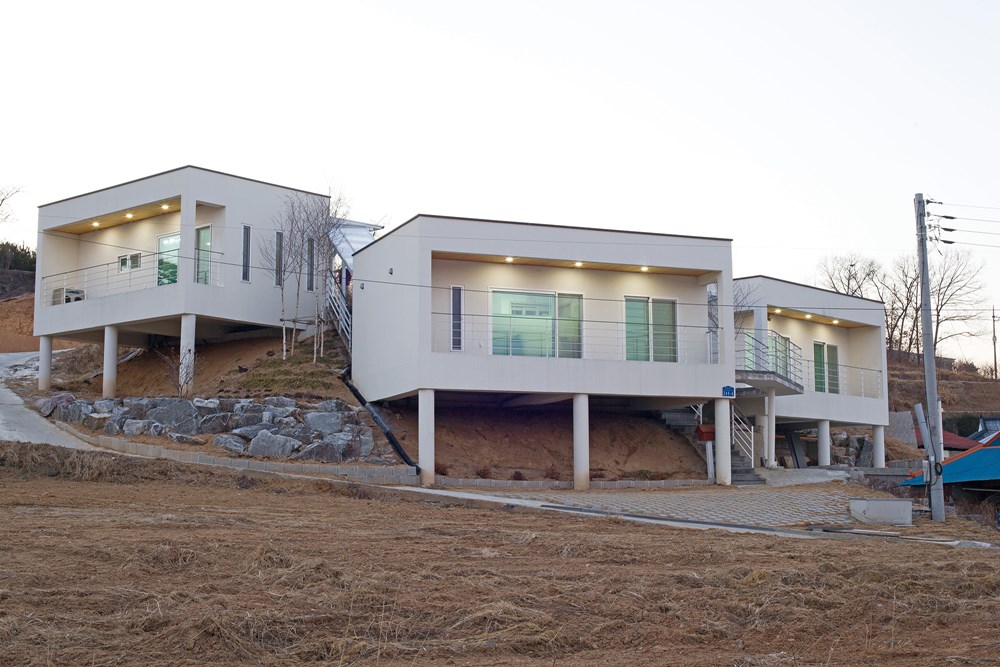 저마다 다른 위치, 높이, 그리고 방향으로 작은 집 3개 동을 과수원의 경사면에 배치시켜 본다.