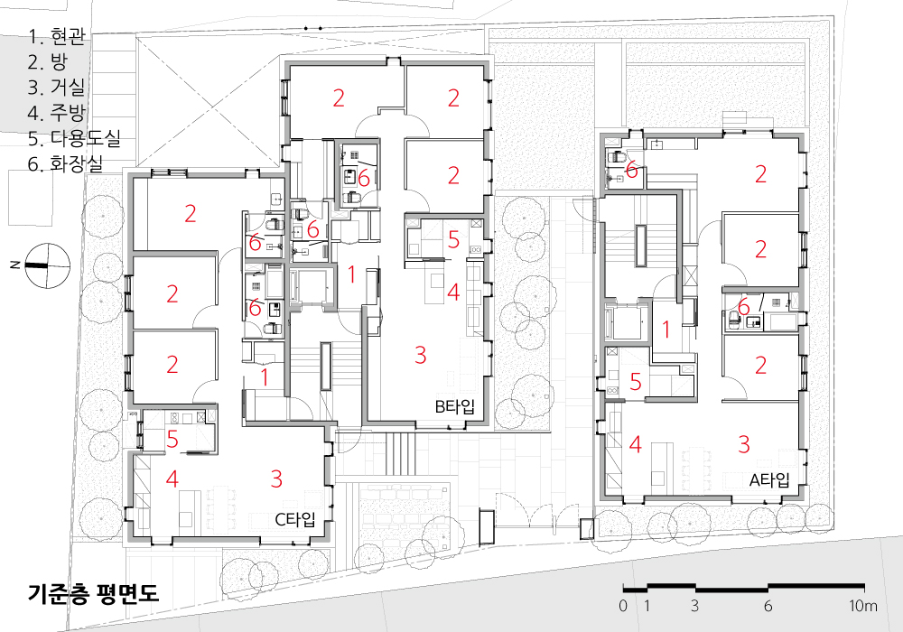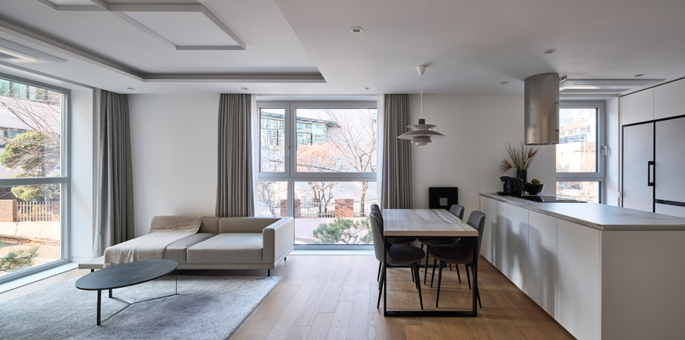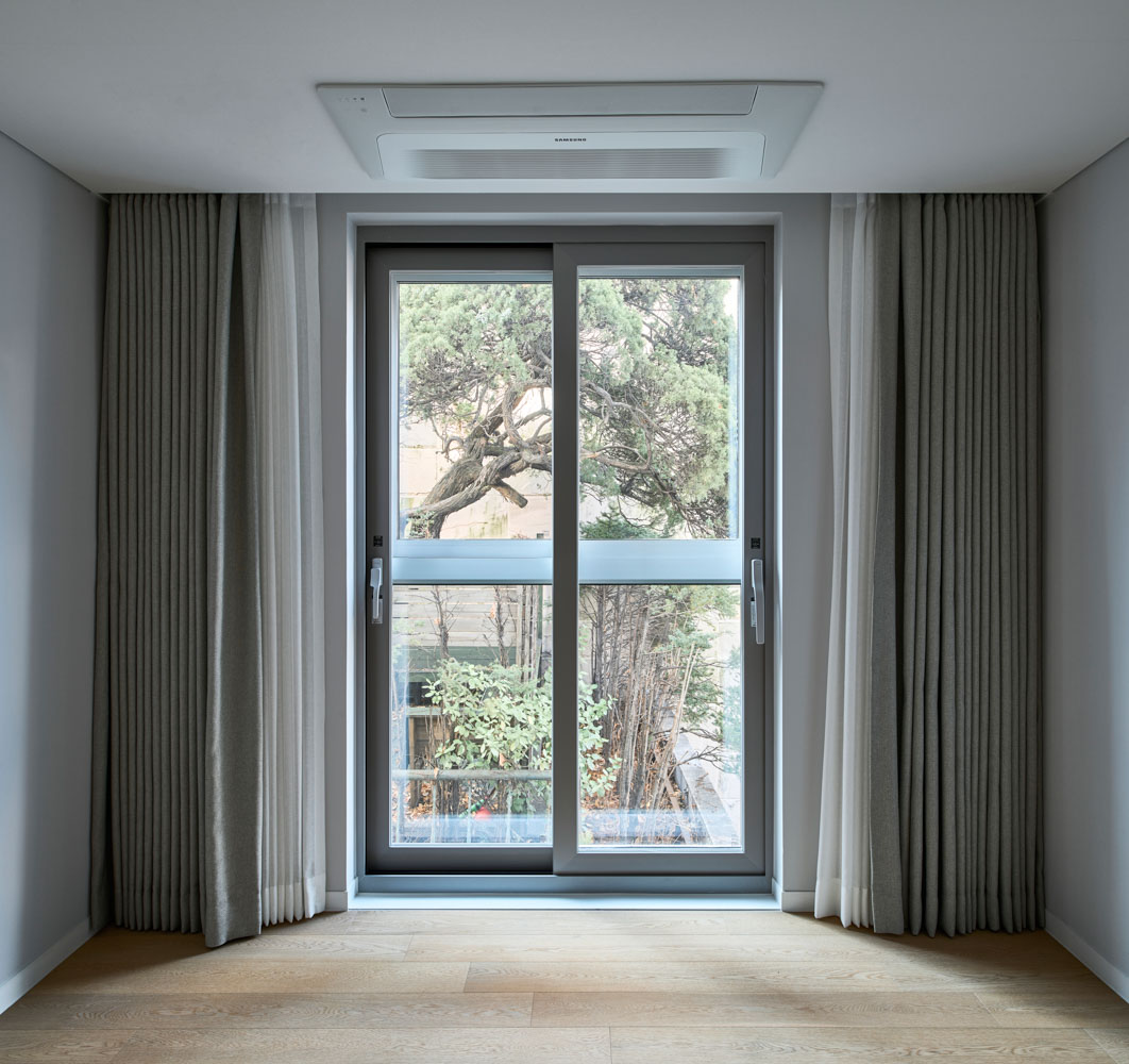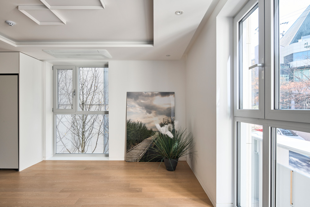 획일화된 평면적 동일함이 공평한 것은 아니라는 공유된 생각을 거쳐 환경에 따라 개성을 지닌 각각의 유닛이 탄생했다. 밀집된 측면과 대비되어 크게 비워진 서측면을 전면으로 삼아 주요실을 배치했다. 주요실을 명쾌하게 배치하고, 나머지 실은 복도공간으로 자연스럽게 엮어 작지만 강한 감흥의 방향성을 제시하였다. 공간이 내부에 국한되지 않도록, 창을 통해 여러 방향으로 깊이 있게 확장되도록 세심하게 배려했다.