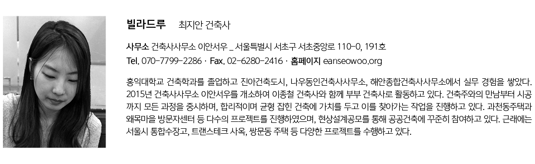 | 빌라드루 설계자 | 최지안 건축사 _건축사사무소 이안서우 건축주 | 조은선 외 9인 감리자 | 와이엠스튜디오 건축사사무소 시공사 | 영조건설 사업관리자 | 리슈건축 설계팀 | 이종철 대지위치 | 서울특별시 서초구 사평대로16길 25 주요용도 | 공동주택(단지형 다세대) 대지면적 | 700.60㎡ 건축면적 | 353.57㎡ 연면적 | 1,548.81㎡ 건폐율 | 50.47% 용적률 | 149.8% 규모 | 지하 1층 - 지상 5층 구조 | 철근콘크리트구조 외부마감재 | 석재 및 칼라강판 내부마감재 | 석고보드 위 도장, 강마루 설계기간 | 2018. 06 - 2019. 09 공사기간 | 2019. 10 - 2020. 11 사진 | 최진보 구조분야 : (주)허브구조엔지니어링 기계설비분야 : 두현 전기분야 : (주)대경전기설계사무소 |