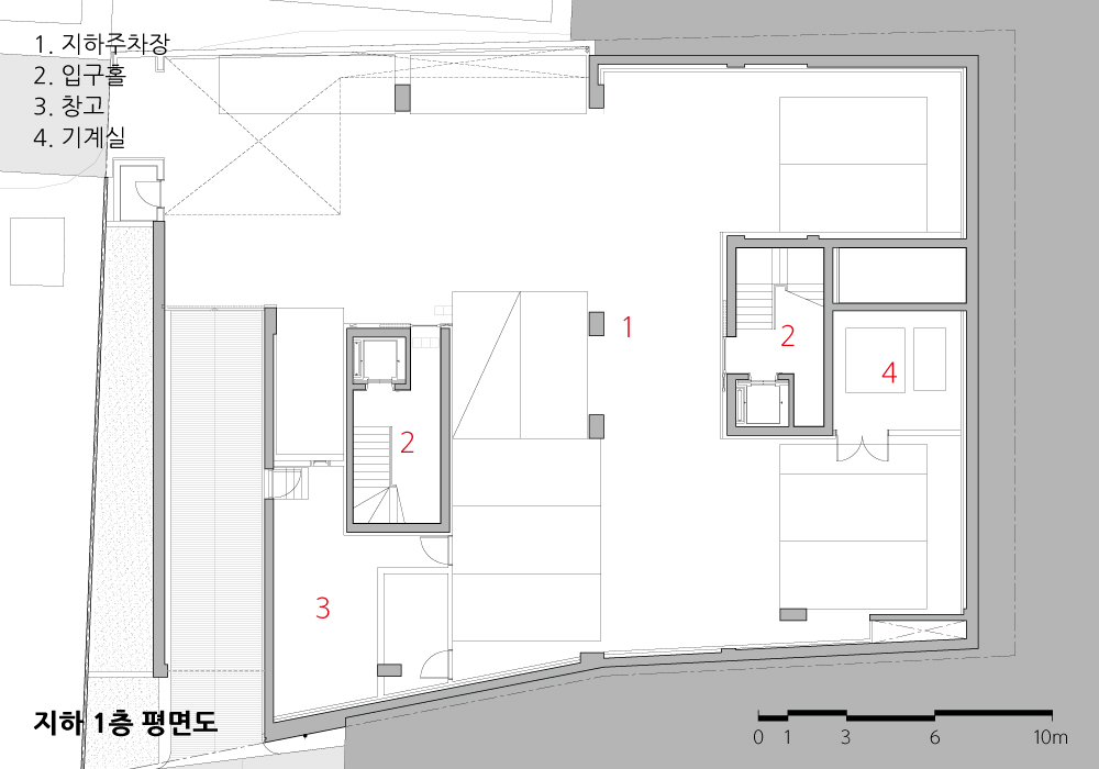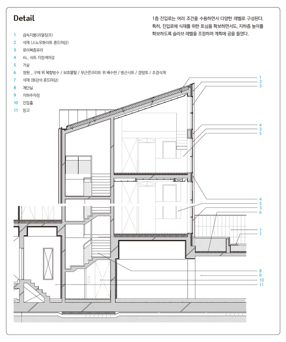 땅이 가진 이야기를 거스르지 않고 받아들인다. 경사 레벨을 활용하여 지상 진입로를 풍요롭게 하고, 활용되지 않던 막다른 도로를 지하와 연결하여 편의를 위한 또 다른 진입로를 만들었다.