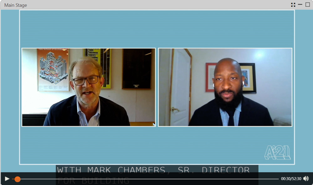 1:1대담에서 사회자는 일자리와 건축 환경, 특히 인프라 계획에 대한 바이든 행정부의 계획이 무엇인지 그리고 더 넓은 건축 산업(Construction Industry)의 관점에서, 특히 건축사(가)에게 어떤 가능성이 있는지, 더 나아가 이러한 구축 환경의 작업 및 인프라에 대해 무엇을 할 계획인지 질문하였고 마크 챔버스는 현 정부의 기후 환경문제와 관련된 탄소저감정책과 그로 인한 건축에서의 가능성, 예를 들어 지속 가능한 저탄소를 지향하는 건축·코드·표준·지침·파일럿 프로젝트의 국가적 주도로서의 추진, 이것을 활성화하기 위한 세금 인센티브 등, 그리고 그러한 인프라 구축에서의 건축 환경의 큐레이터로서의 건축사의 역할과 필연적으로 생성되는 고임금의 일자리 창출의 청사진까지 토론하였다.