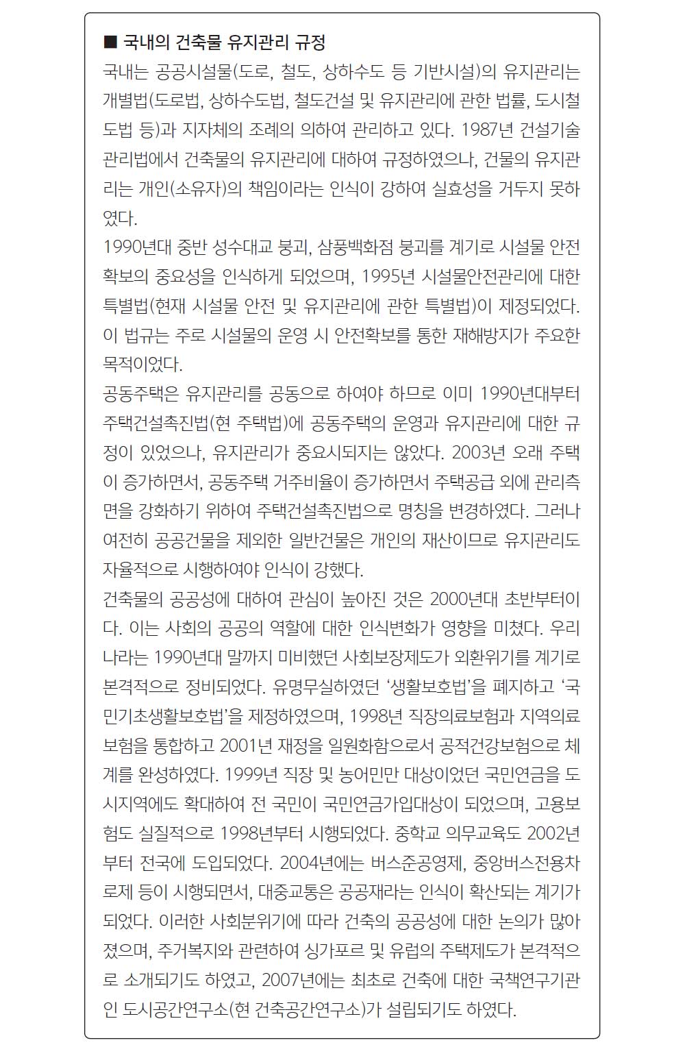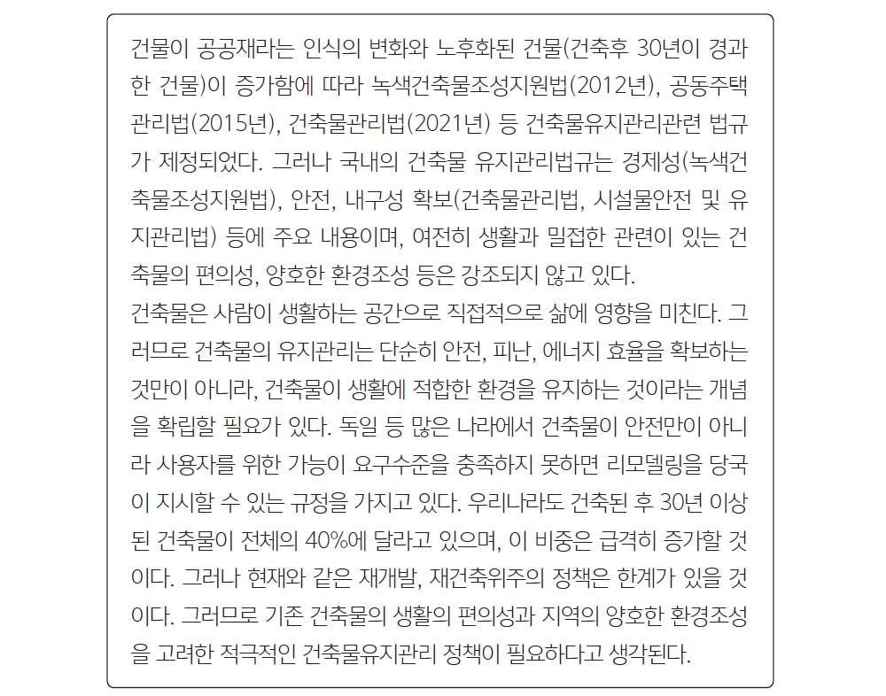 남한과 비교하여 북한의 건축의 가장 독특한 점은 국가가 주택을 포함한 도시의 건물과 시설물 유지관리를 담당하는 것이라고 생각된다. 북한은 공공시설물(기반시설)만이 아니라 주택과 건물도 국가(혹은 지방정부 및 단체) 소유이므로, 국가에 유지관리의 책임이 있다. 우리나라는 기반시설(도로, 철도, 주차장, 정수장, 폐수처리장, 댐, 발전소)와 공공건물은 국가 및 지방정부가 대부분을 소유하고 있으나, 일반저으로 건물과 주택은 개인(법인)소유이며, 정부소유 시설물도(도로, 철도, 발전소, 댐 등)도 정부에서 직접 관리하지 않고 공공기관이 관리하거나 민간업체 위탁하여 관리하는 것이 일반적이므로 북한의 도시경영제도를 이해하는 것이 어렵다.