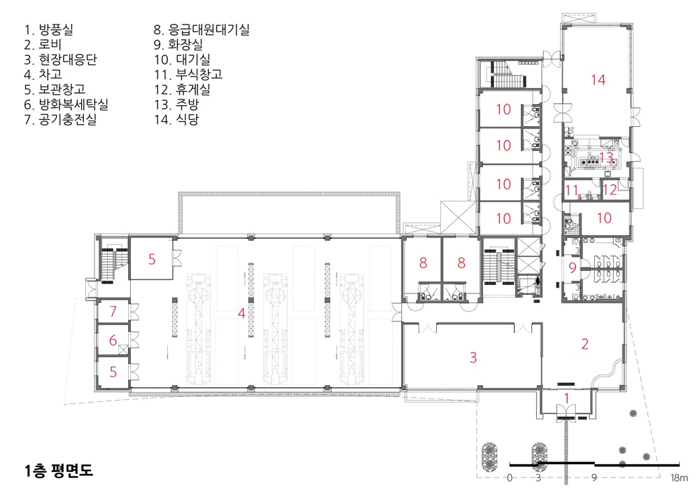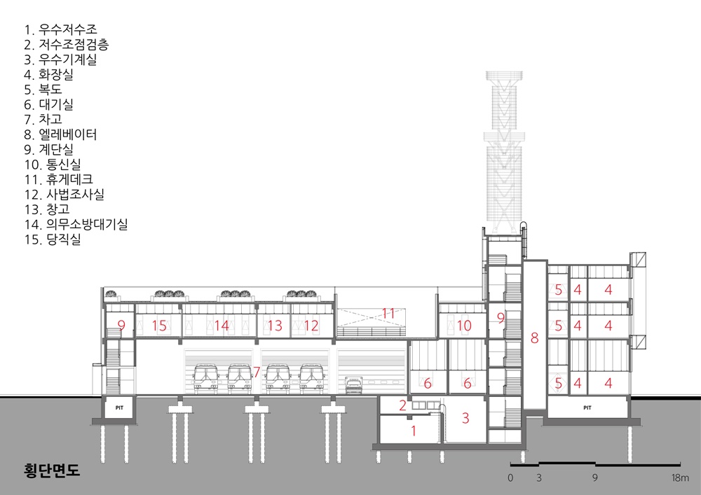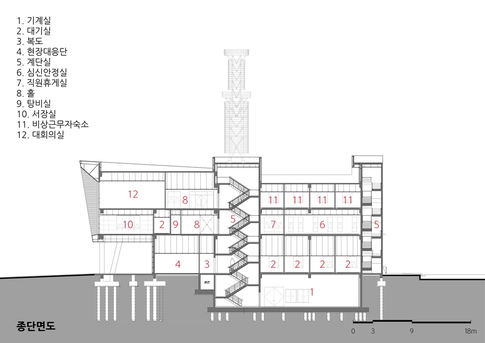 What the most considered in the design of fire station was ‘firefighter’, and I focused on making a 'good space' with excellent function based on an efficient space for them to relax and work. This is the main reason of the southward layout of the zones such as a dispatch area for rapid movement, a mental and physical stabilization room for the rehabilitation of mental and physical fatigue after activities, and a physical training room near accommodation, a rooftop garden, accommodation and variable office space.