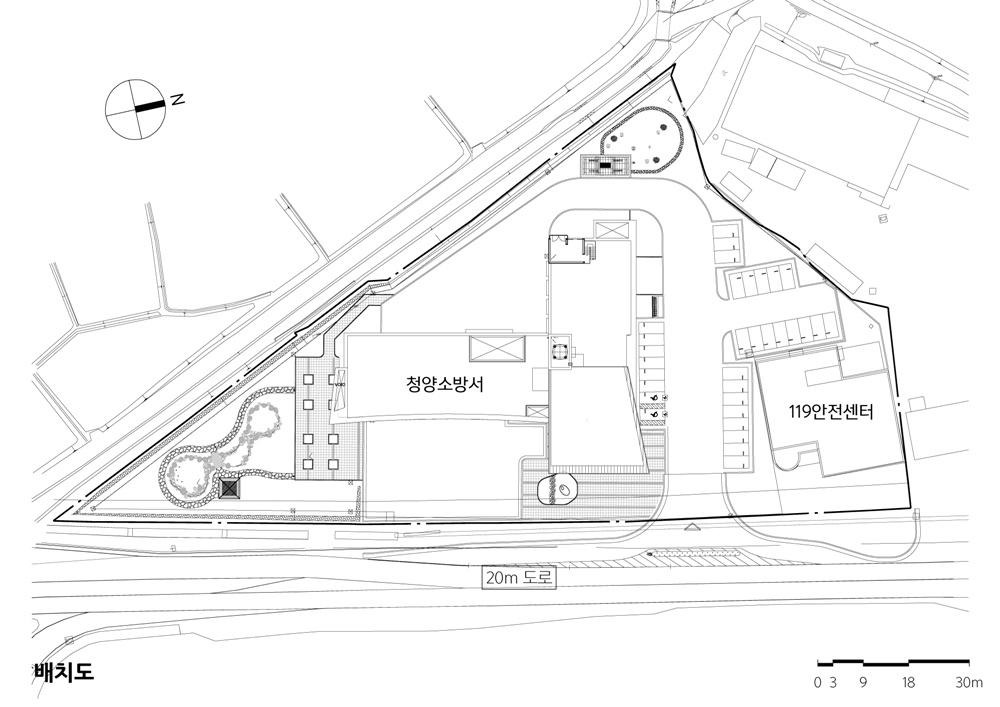 The triangle site located in the outskirts of town of Cheongyang-eup was constructed centering on the fire truck garage. The yard needed for quick dispatch and vehicle rotation and at the same time safety and comfort was secured by separating the walking movement line and the vehicle movement line through the 'T' shape layout of two masses, firefighting area and community area so as not to interfere with the general visitors.