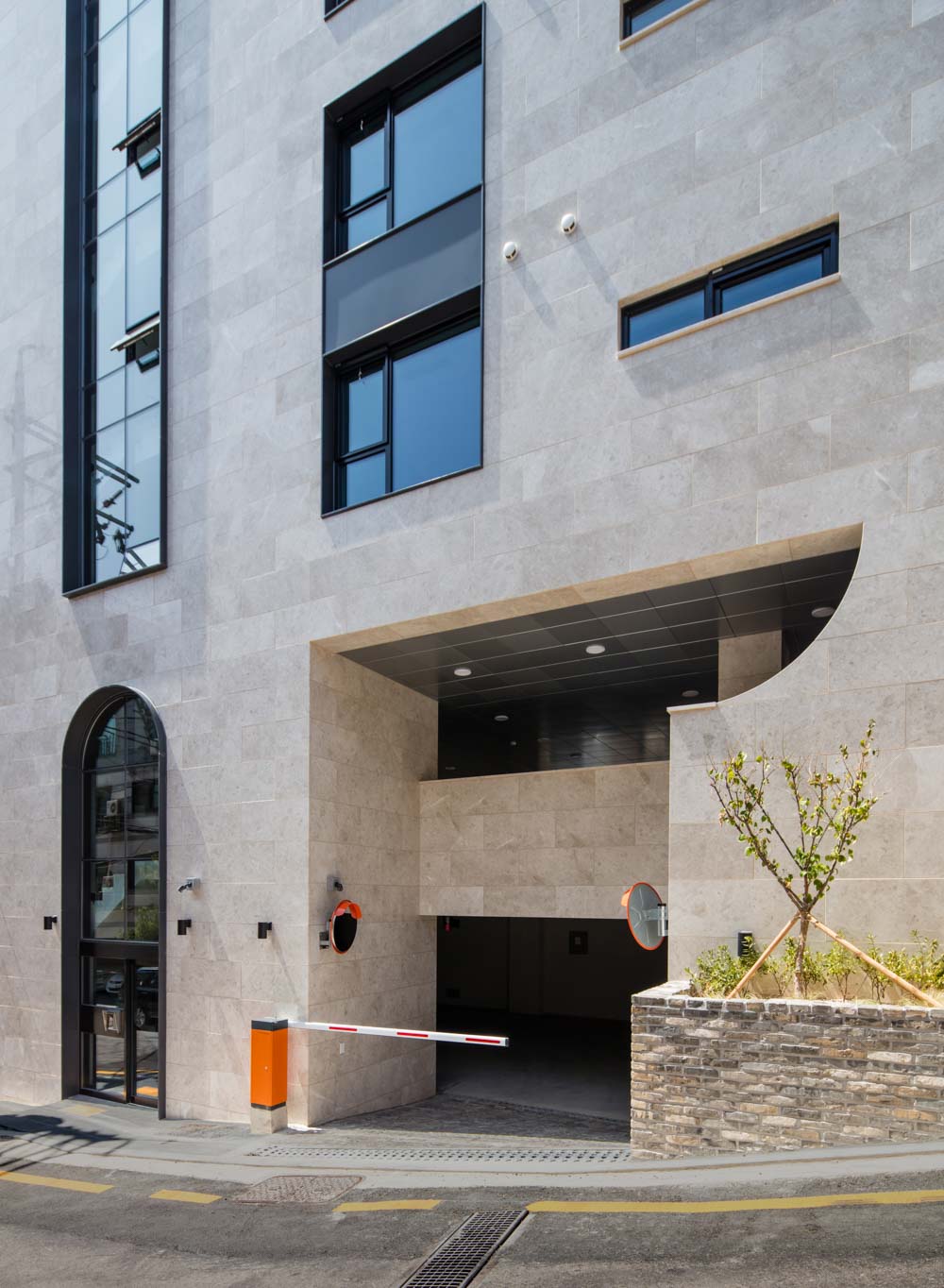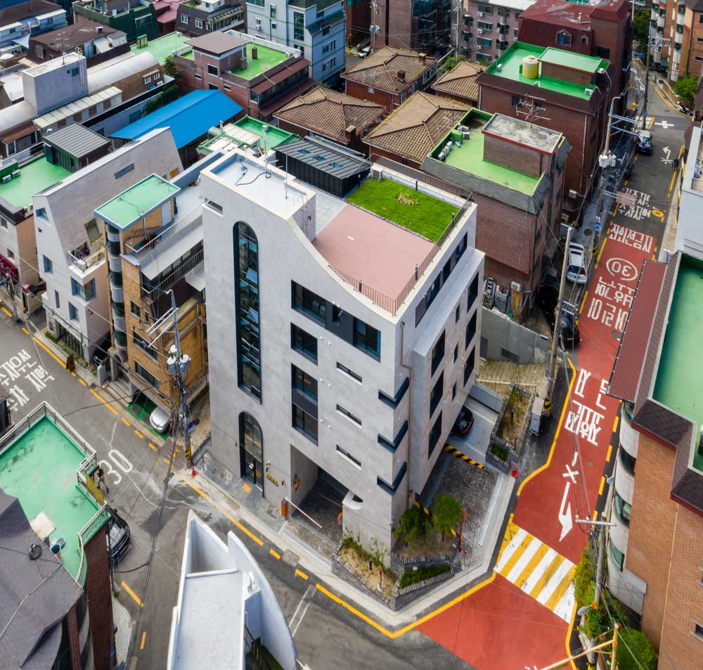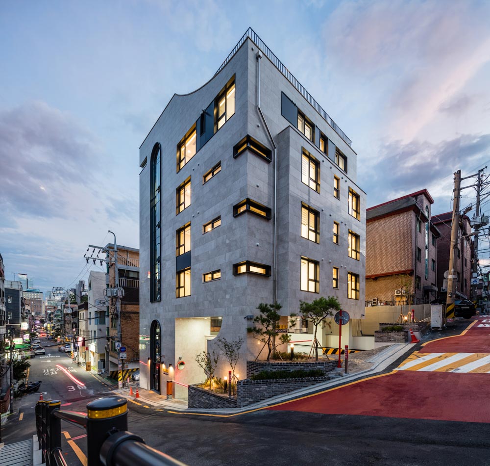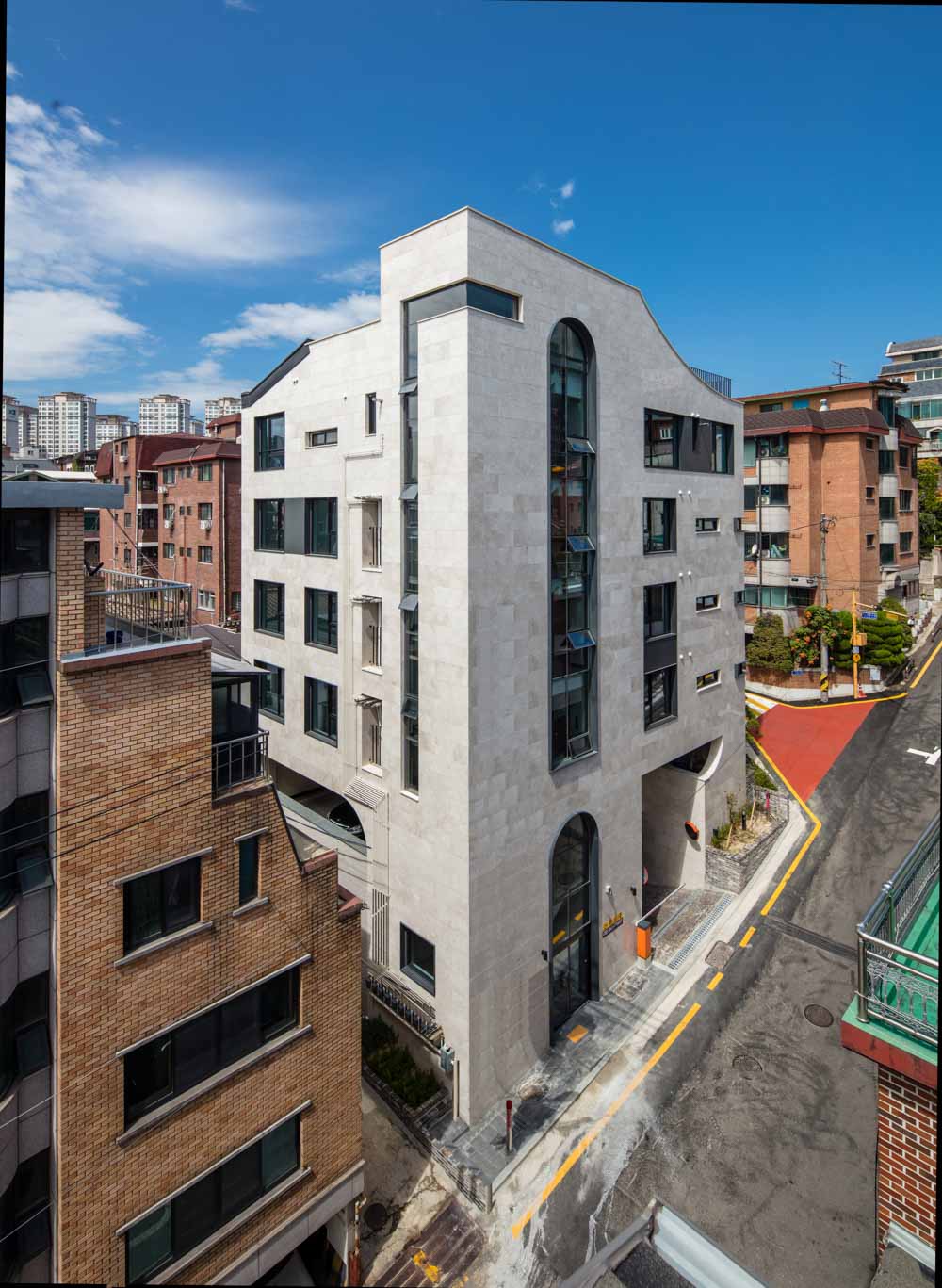 Located in Banpo-dong, Aurum725 multi-unit housing is a typical residential architecture that combines the owner and rental households. Apartment houses have limitations, although architects want to make something different, and Aurum725 tried to break the stereotype of multi-unit housing that architects have been working on. We hoped that the function would not be destroyed, but the appearance and atmosphere would not be that of ordinary multi-unit housing. We wanted to boldly attach the arch and arc to provide elegance and softness along with a vertical line. To satisfy the realistic conditions of profitability and floor area ratio, the novelty of the house had limitations in appearance and format. Still, we hoped to create a multi-unit house with a completely different scenery in an alley in the city. We hoped it would not be an apartment house buried for its' matter-of-factness, but a house with its face.