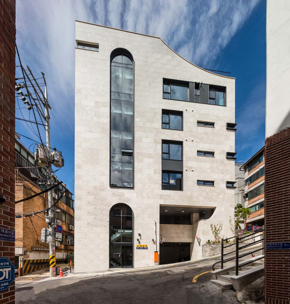 Located in Banpo-dong, Aurum725 multi-unit housing is a typical residential architecture that combines the owner and rental households. Apartment houses have limitations, although architects want to make something different, and Aurum725 tried to break the stereotype of multi-unit housing that architects have been working on. We hoped that the function would not be destroyed, but the appearance and atmosphere would not be that of ordinary multi-unit housing. We wanted to boldly attach the arch and arc to provide elegance and softness along with a vertical line. To satisfy the realistic conditions of profitability and floor area ratio, the novelty of the house had limitations in appearance and format. Still, we hoped to create a multi-unit house with a completely different scenery in an alley in the city. We hoped it would not be an apartment house buried for its' matter-of-factness, but a house with its face.