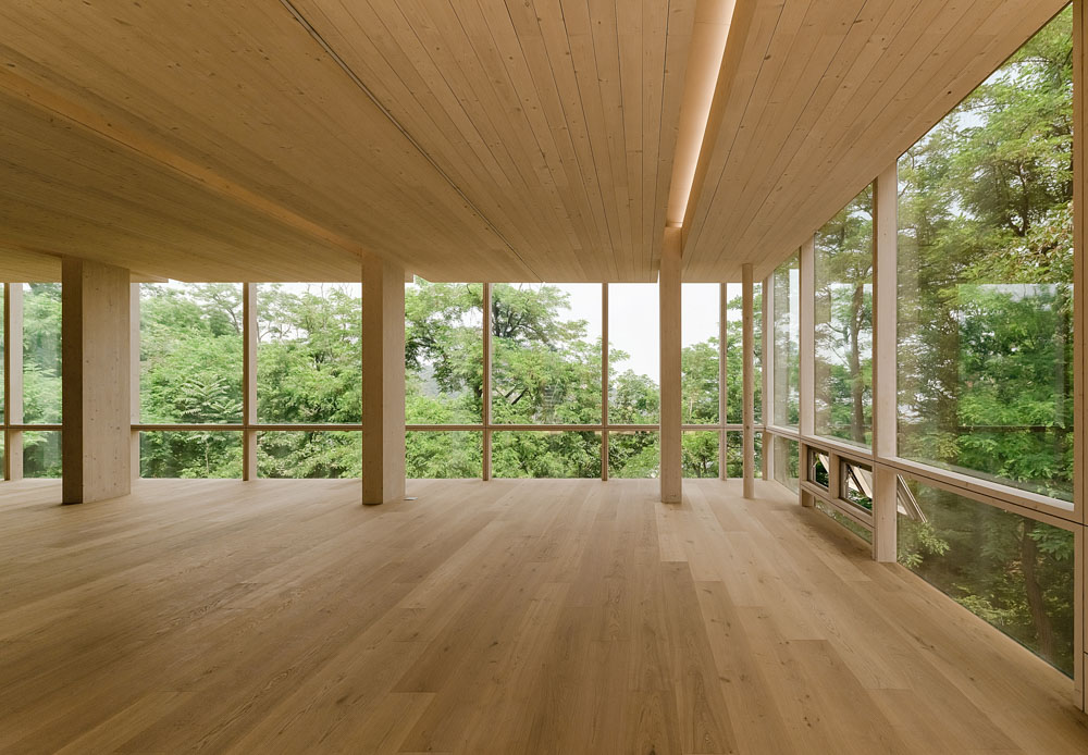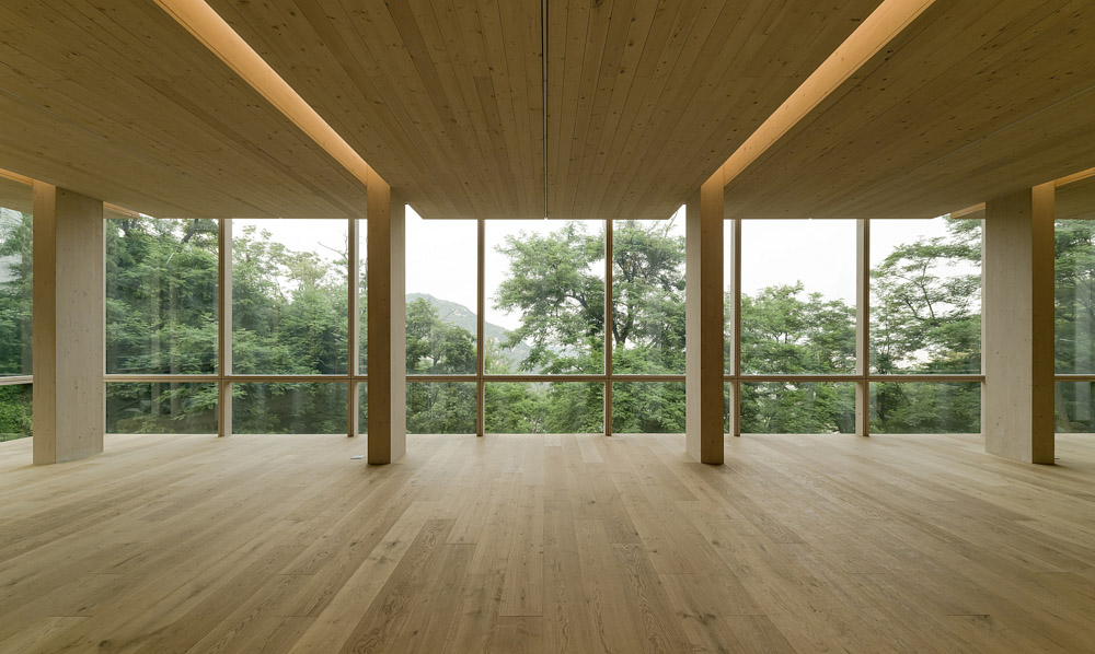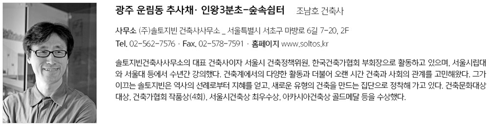 Wood construction is a method of assembling a three-dimensional structure by making materials in three dimensions. Architect Gottfried Semper defined this method as tectonic. Wire rod materials of various sizes from a structure through alignment and combination according to the hierarchy. The impression of the Inwangsan 3 guard post shelter made it look out of the typical principle of wooden structure principle. Glulam pillars were set at 1/2 intervals between the reinforced concrete piloti pillar modules, and roof plates (4,000×10,000×500㎜) were inserted between them. Massive roof plates refuse the generalized logic for load transmission by being inserted without being placed on glulam pillars. Indirect lighting of gaps emptied by pillars emphasizes the different effects. The 'heaviness' as that thick and colossal roof plate gives is replaced by a 'lightness' as if floating due to differences in construction methods. This physically shows the constructive paradox. (Written by Namho Cho, CEO of Soltozibin Architects / MC reporter Yookyung Bang)