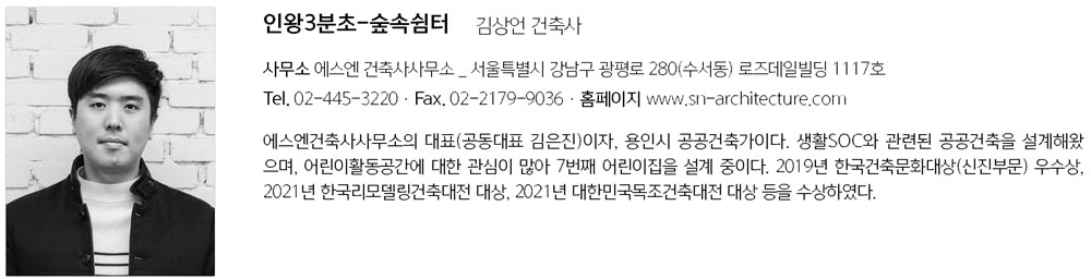 | 인왕3분초-숲속쉼터 설계자 | 조남호 / 김상언 · 김은진 _ (주)솔토지빈 건축사사무소 / 에스엔 건축사사무소 건축주 | 종로구청 감리자 | 조남호 _ (주)솔토지빈 건축사사무소 시공사 | (주)수피아건축, 아지건설 설계팀 | (주)솔토지빈 건축사사무소 + SN 건축사사무소 대지위치 | 서울특별시 종로구 청운동 산4-36 군초소(인왕 3분초) 주요용도 | 제1종 근린생활시설 대지면적 | 48,153㎡ 건축면적 | 222.75㎡ 연면적 | 240.56㎡ 건폐율 | 50% 용적률 | 50% 규모 | 지하 1층, 지상 1층 구조 | 철근콘크리트구조(기존 하부) ,목구조(신설 상부) 외부마감재 | 스틸그레이팅, 목재 사이딩 내부마감재 | 목재, 마루 설계기간 | 2018. 12 - 2019. 05 공사기간 | 2019. 07 - 2020. 12 사진 | 김용순 구조분야 : (주)수피아건축 / 황경주 _ 서울시립대 기계설비분야 : 진원기술 전기분야 : 엘림전설 |