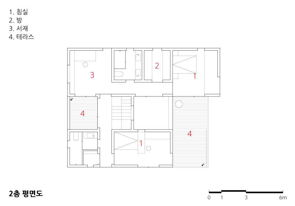 1개의 중정과 2개의 테라스는 거실, 침실이 남향으로 배치되는 것을 가능하게 한다.