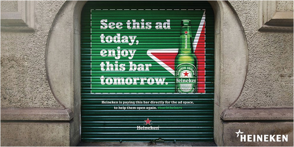 하이네켄은 코로나로 문을 닫은 전 세계 약 5,000개 이상의 술집(bar) 셔터문에 광고를 붙였다. 닫혀 있는 셔터를 옥외광고판으로 활용한 것이다. 그리고 광고비를 술집에 직접 주어 술집 주인들의 손해를 조금이라도 만회해 주었다. 하이네켄은 전통적으로 해외 광고비의 10%를 버스 정류장이나 야외 전광판 등의 옥외광고에 써왔는데, 그 비용을 셔터 광고에 쓴 것이다.